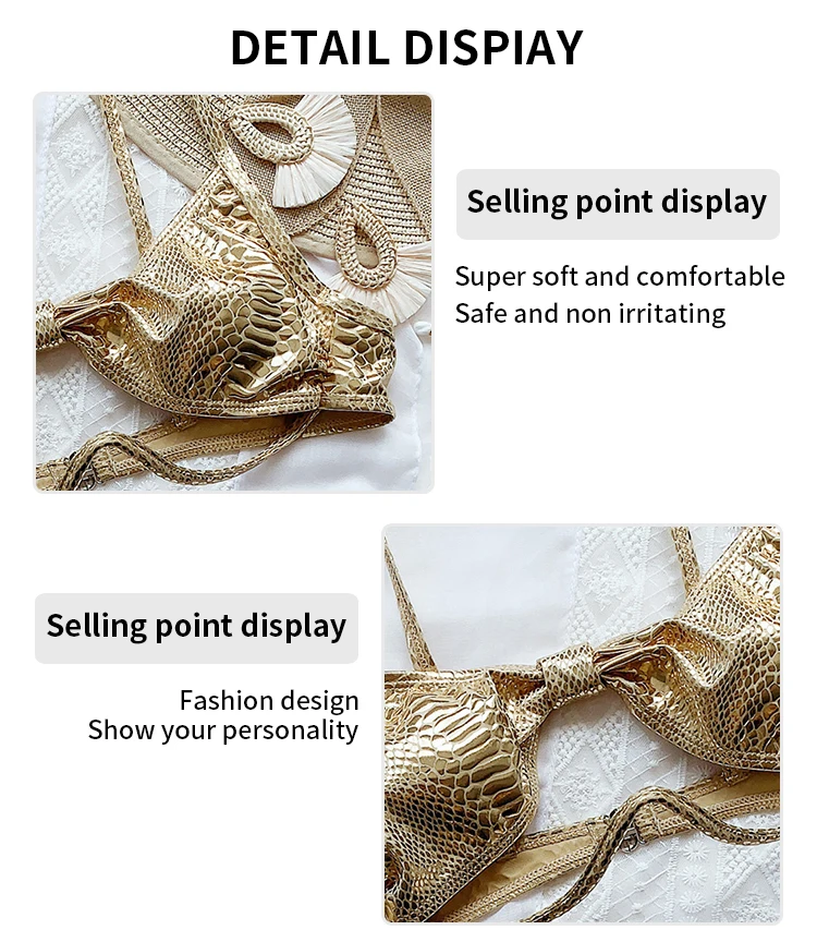 Fashion Women Sexy Two Piece Micro Sling Underwire Glitter Butterfly Leather Snake Skin Cutout Bikini