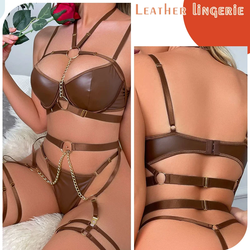 New Retro Leather Metal Chain Decoration Women'S High Quality Lingerie Sets Girls Wear Sexy Lingerie Butterfly Thong
