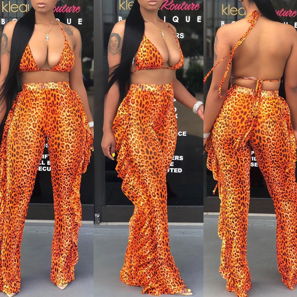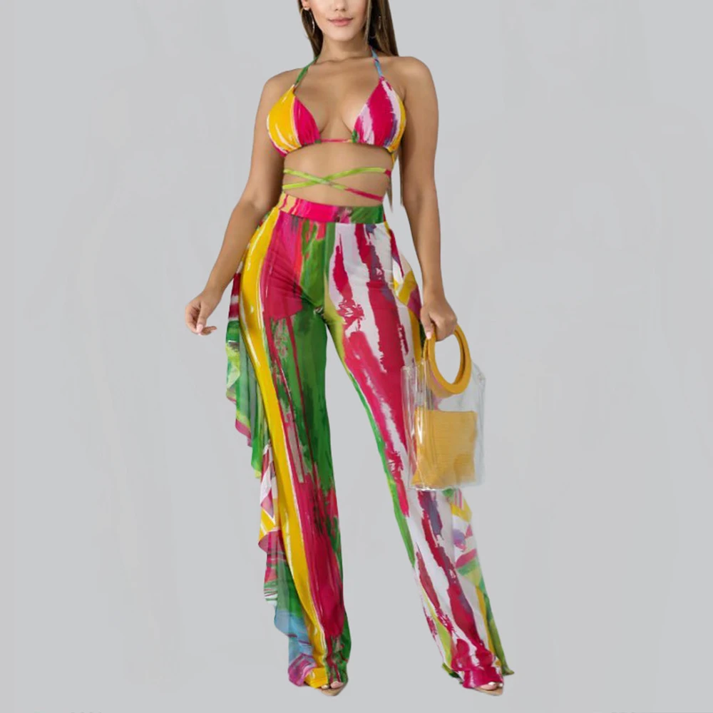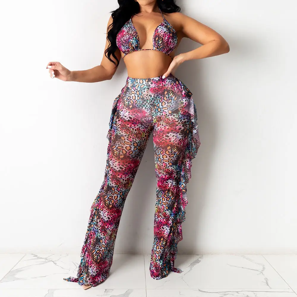 New Design Butterfly Print Long Wide Leg Ruffle Mesh Beach Bathing Suits 3 Piece Sexy Women Cover up Beachwear