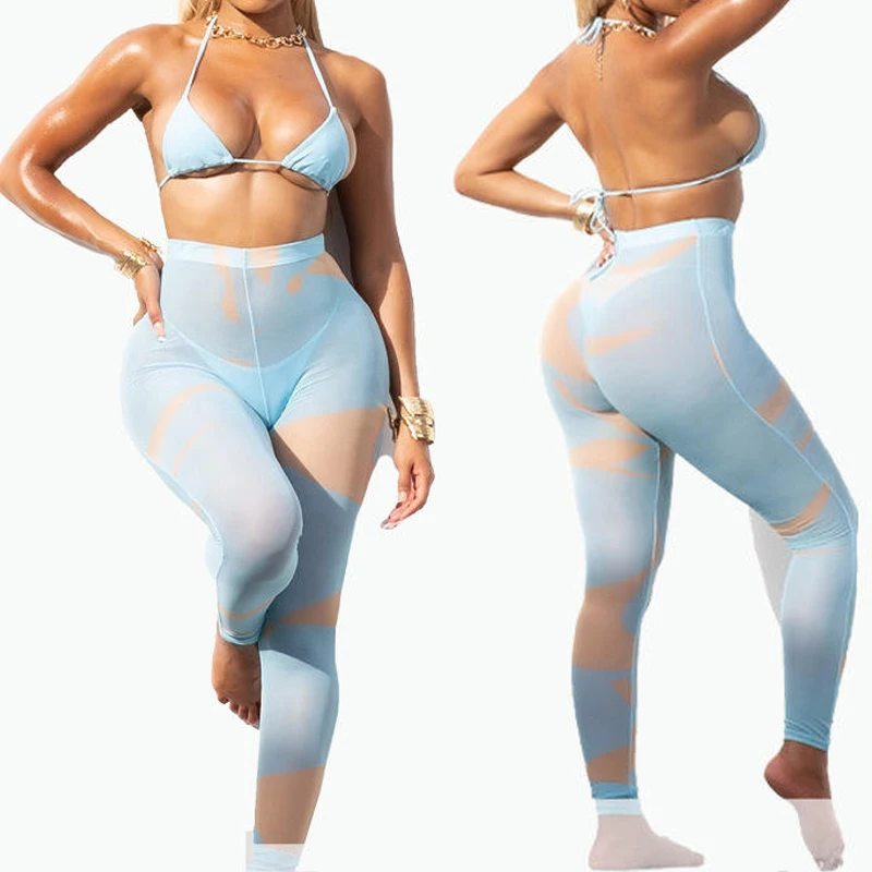 Custom Women Sexy Swimming Suits Luxury Bikini Three Piece Swimsuit See Through Mesh Trousers Long Skirt Cover up Swimwear