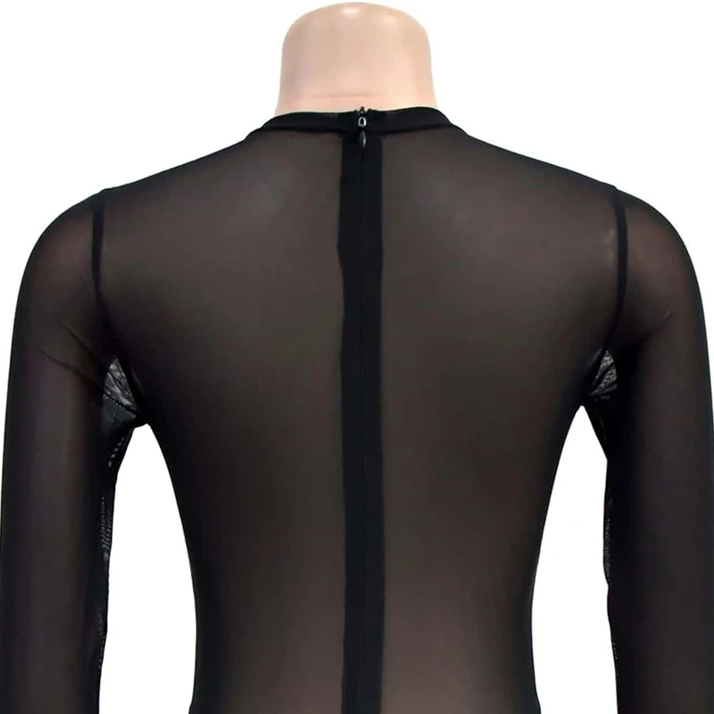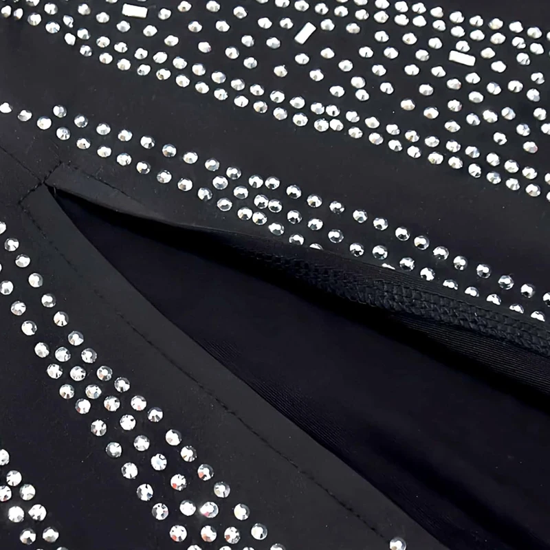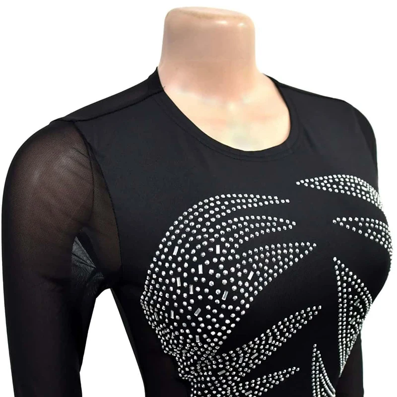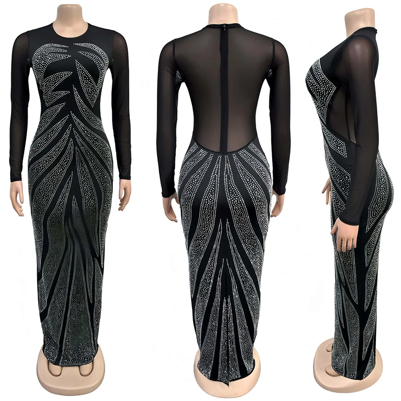 High Quality Vintage Diamond Patterned Floor-Length Long Sleeved Black Semi-Transparent Women's Dress for Party