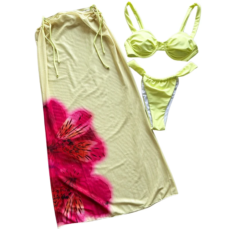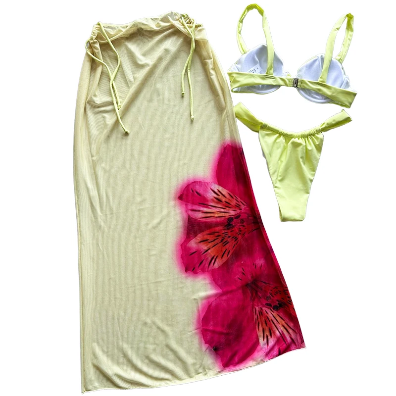 New Design Three-Piece 2026 New Style Bikini Sexy Print Split-Sleeved Cover-Up Long Skirt Women's Swimwear Set Spandex/Polyester