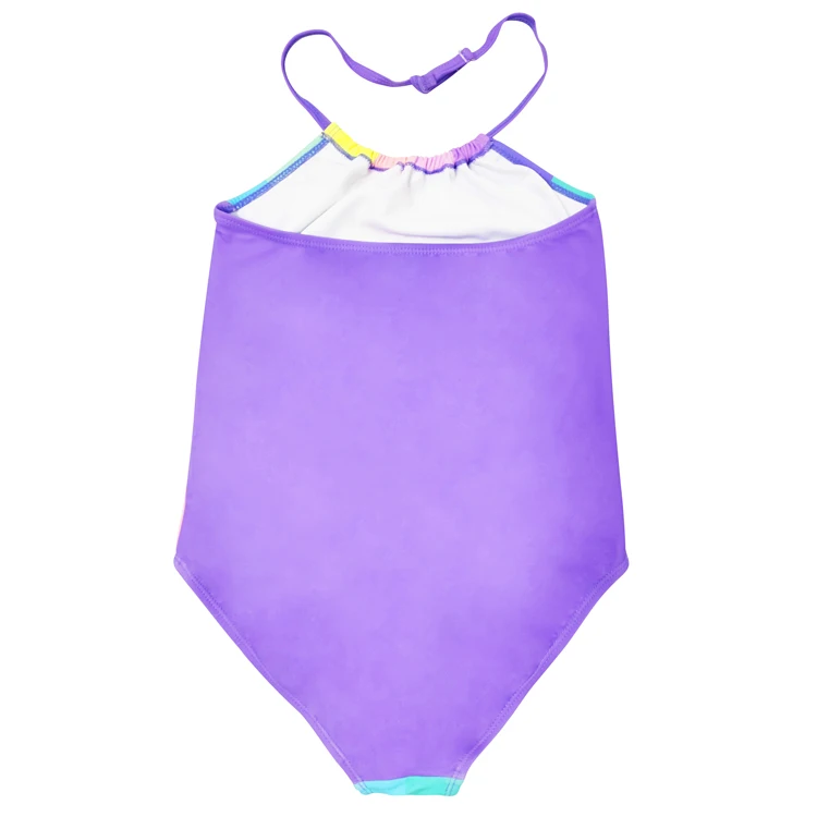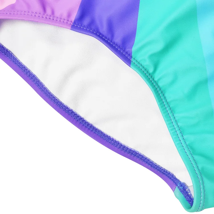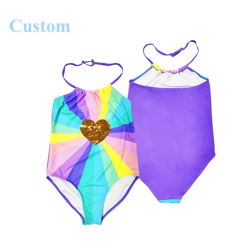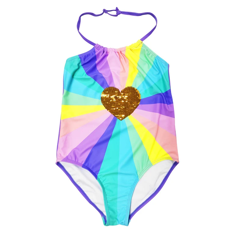 Customized One Piece Girls Halter Swimsuit Beachwear with Sequin Heart Unique Rainbow Stripes Kids Swimwear Bathing Suit