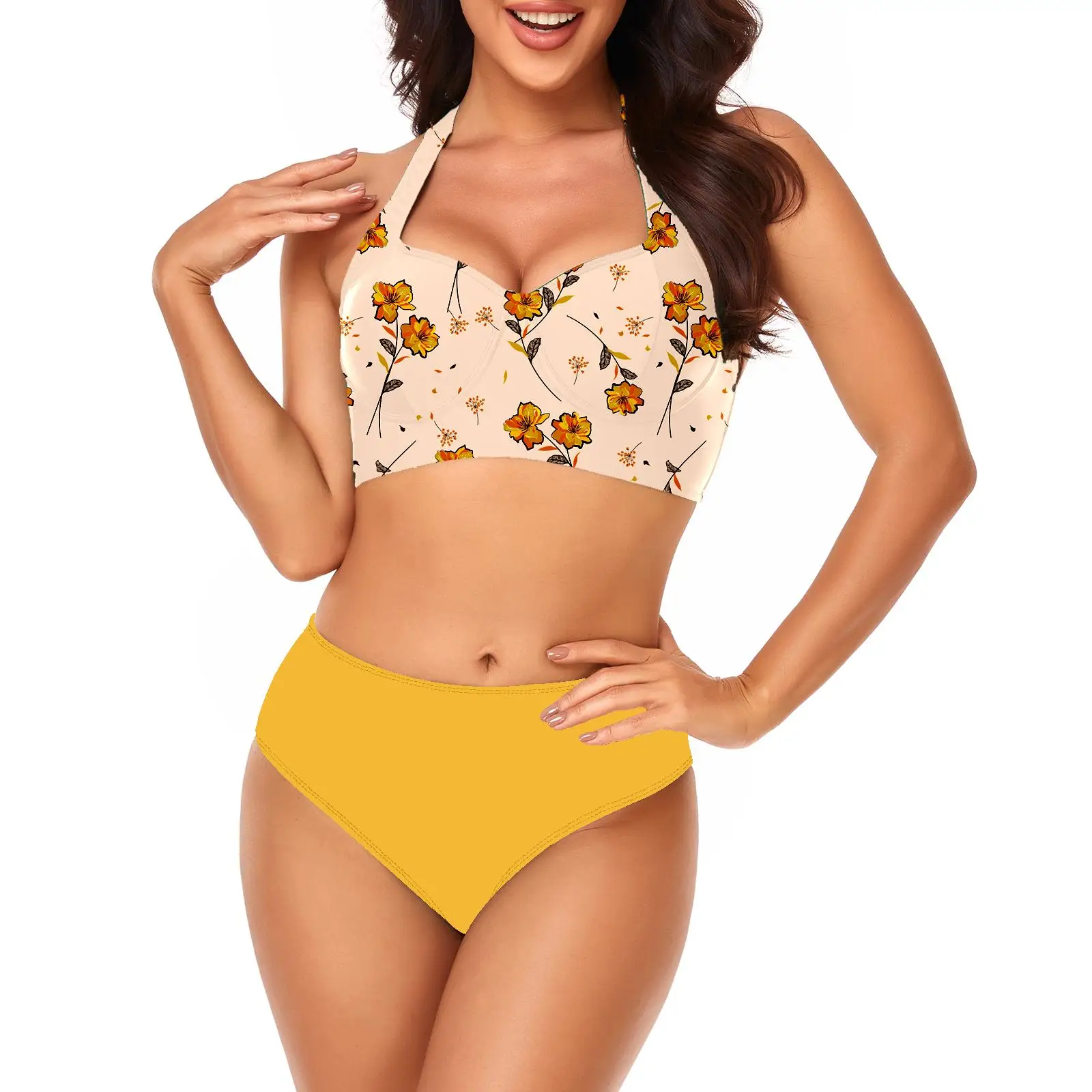 2026 Women Wholesale 2 Pieces Bikinis Vintage Pint Retro Style Halter High Waist Bottom Bikini Set Swimsuits