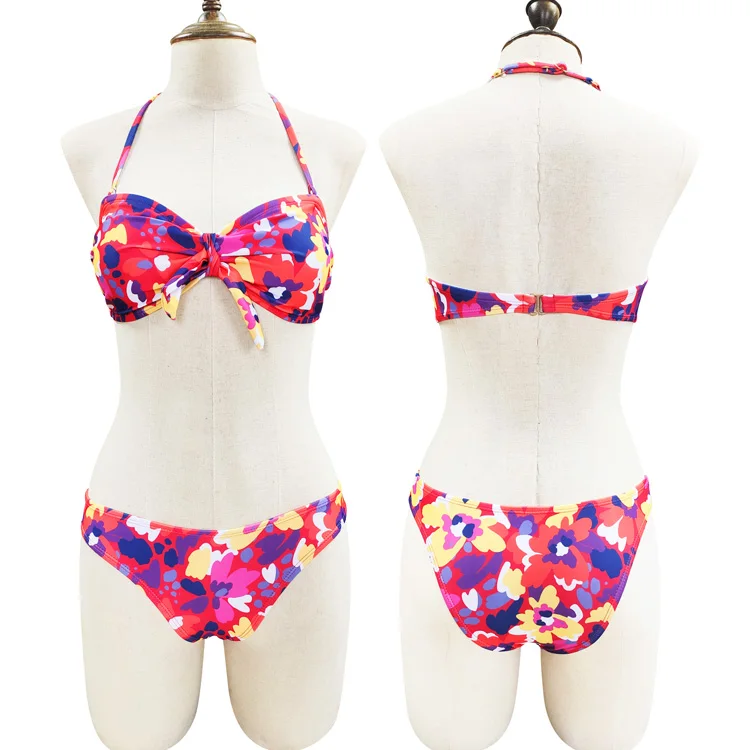 Women's Sexy Floral Print Two Piece Bikini Triangle Halter Top With Tie Front Spaghetti Strap Bikinis OEM Custom Logo Beachwear
