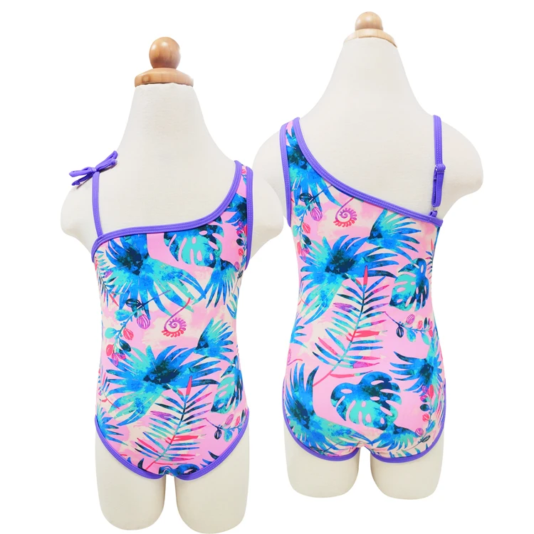 UPF50+Sun Protection Kids One Piece Swimsuit Irregular Shoulder Floral Print Swimwear Soft Girls Bathing Suit for Pool Beach
