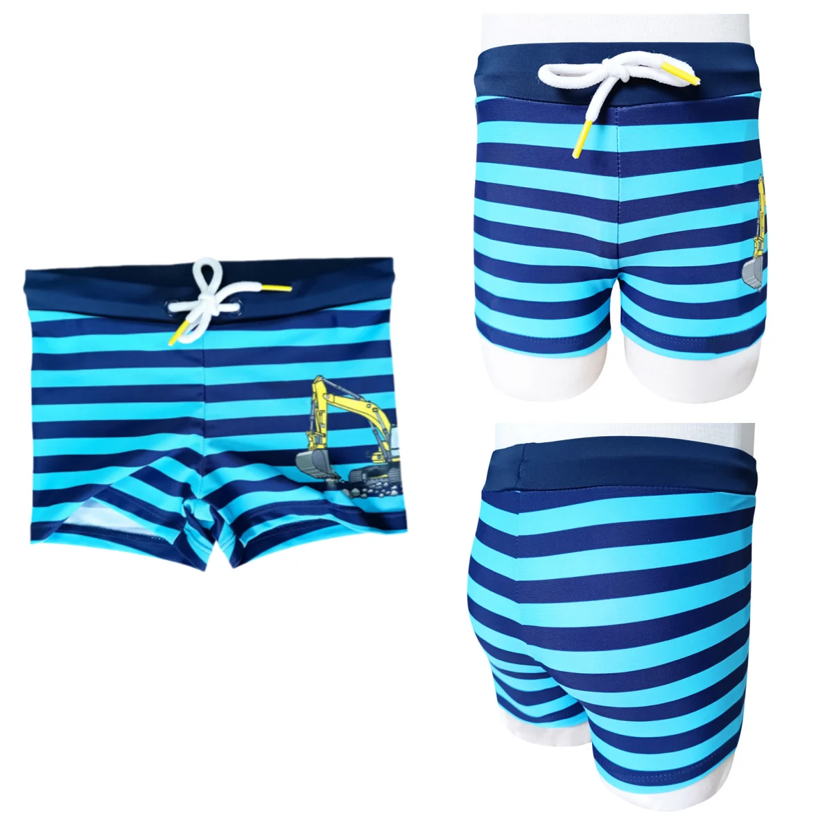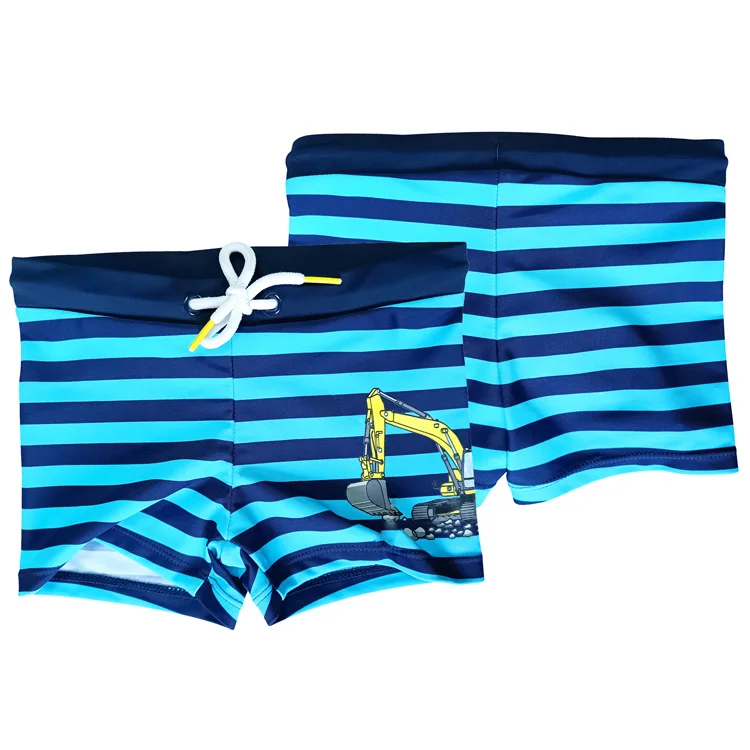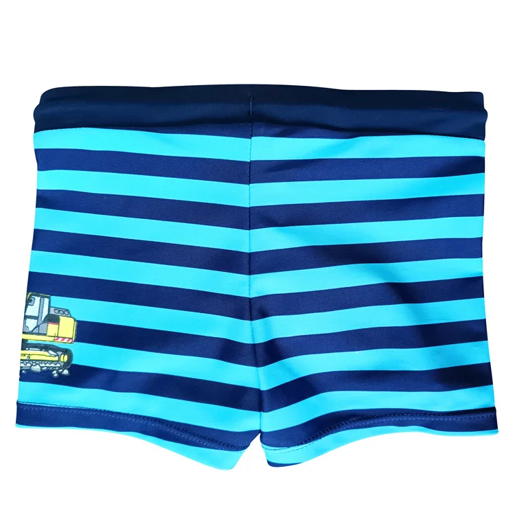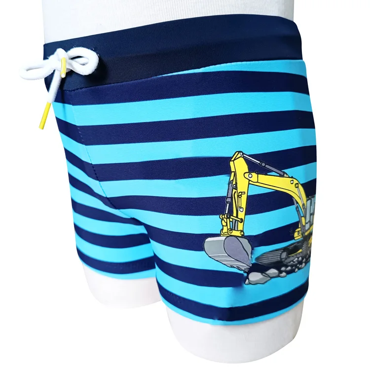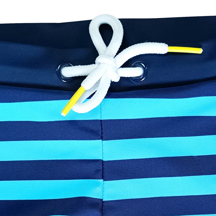 Boys' Swim Trunks with Four-Way Stretch Elastic Waistband Drawstring Custom Printed in Deep Blue & Light Blue Stripes for Summer