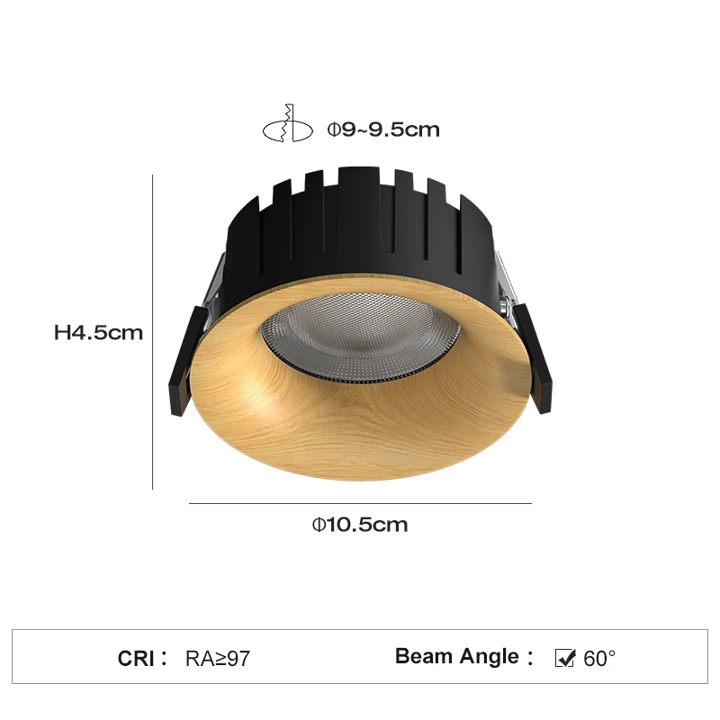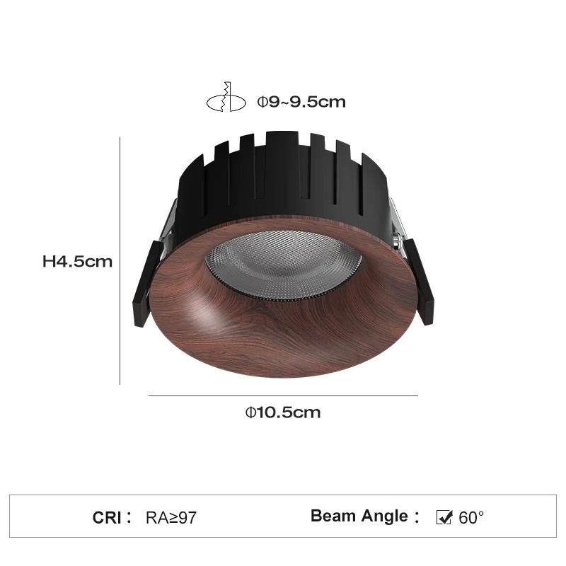 PULUOTI 90-95mm LED 60° Recessed Downlight 15W Walnut Full Spectrum Anti-glare Eye protection Living Room Bedroom Spot Lights