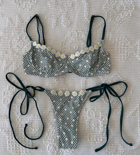 Designer 2026 Women's Green High-Leg Triangle Bikini Set Custom Logo Swimwear Lace Floral Print Striped Two-Piece Swimsuit