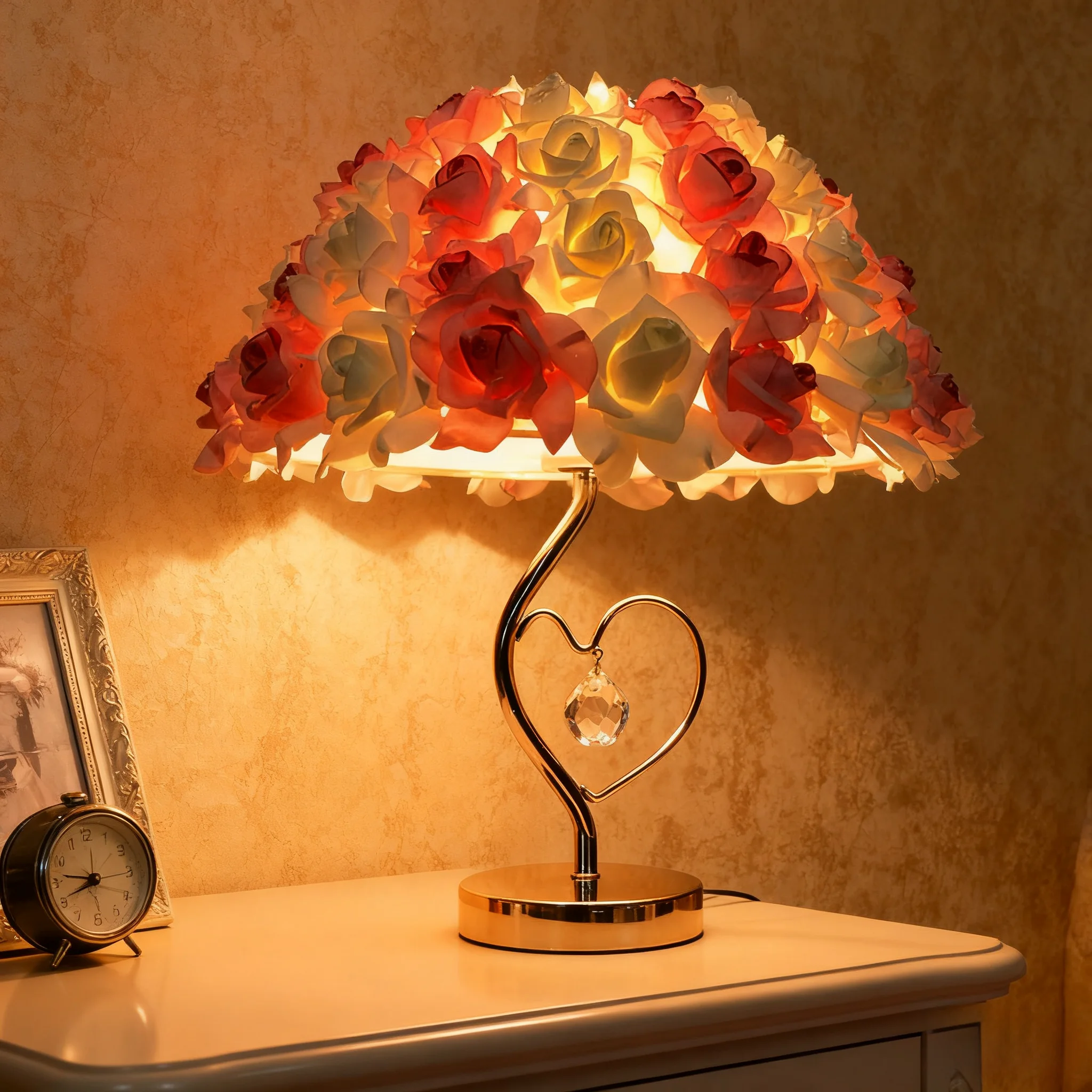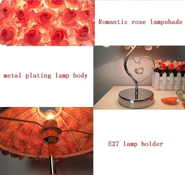 JACKSUN Pink Rose Flowers Table Lamp Push Button Bedside Nightstand Light Wedding Decor Flower Desk Lamp
