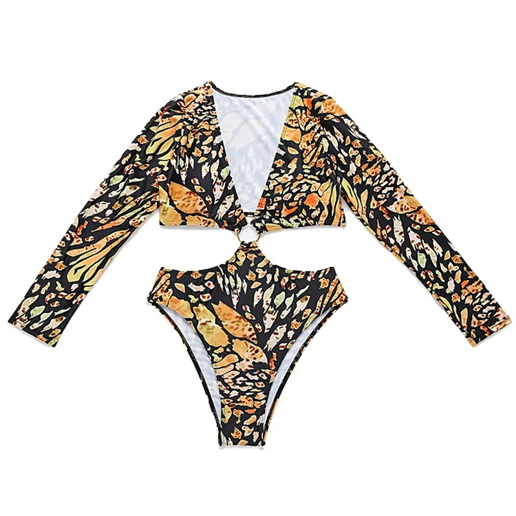 Summer 2023 Bikini Swimwear Sexy Deep V-neck Female Swimwear One Piece Long Sleeve Swimsuit Leopard Printed Bikini for Ladies