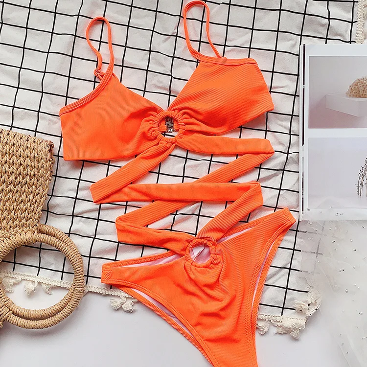 2021 New High Waist One-Piece Swimsuit for Adult Women Polyester Cross Lace-Up Ring Bikini Female Swimwear Design
