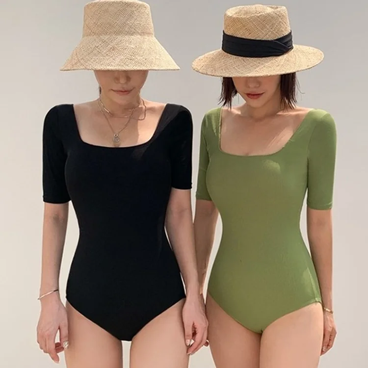 Fashion Korean Style One-piece Short Sleeve Swimsuit Wholesale Women High Waist Square Collar Swimwear Solid Bikini for Ladies