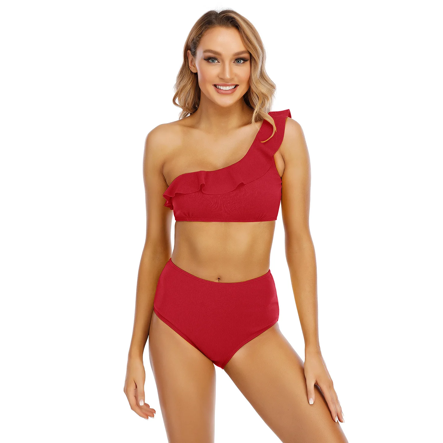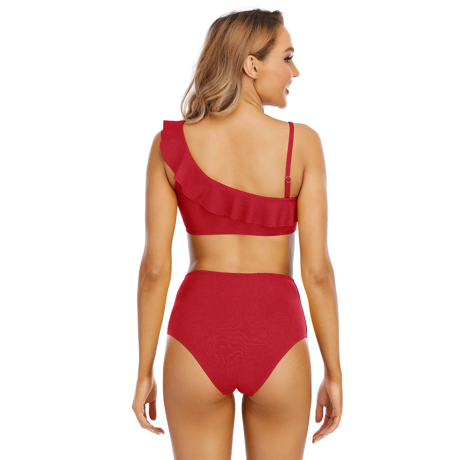 2026 Women's Sexy One Shoulder Ruffled Bikini Swimwear Custom Logo Tankinis with Geometric Pattern New Design 2-Piece Swimsuit