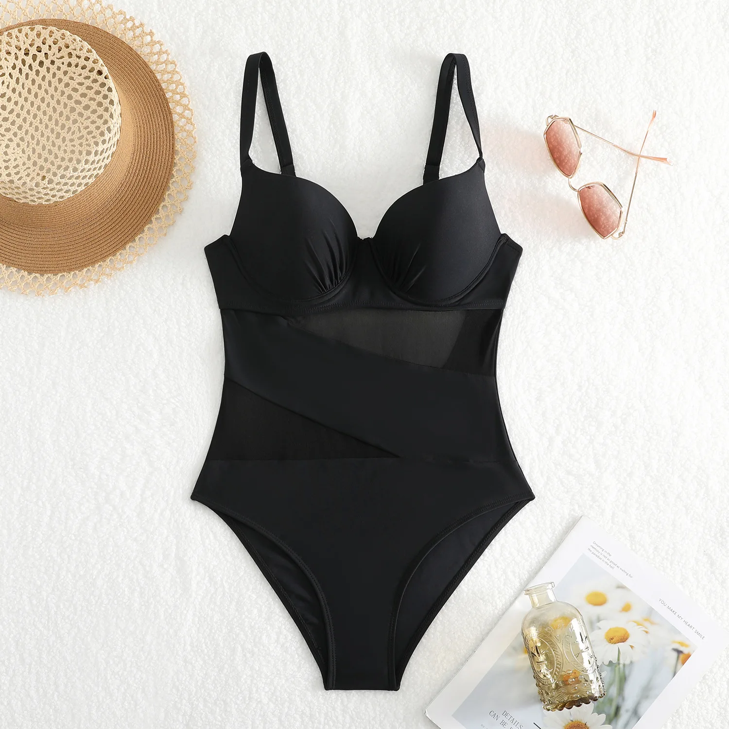 Custom Black Solid One Piece Women's Swimwear Sexy Mesh Summer Beach Bathing Suit V-Neck Backless Swimwear