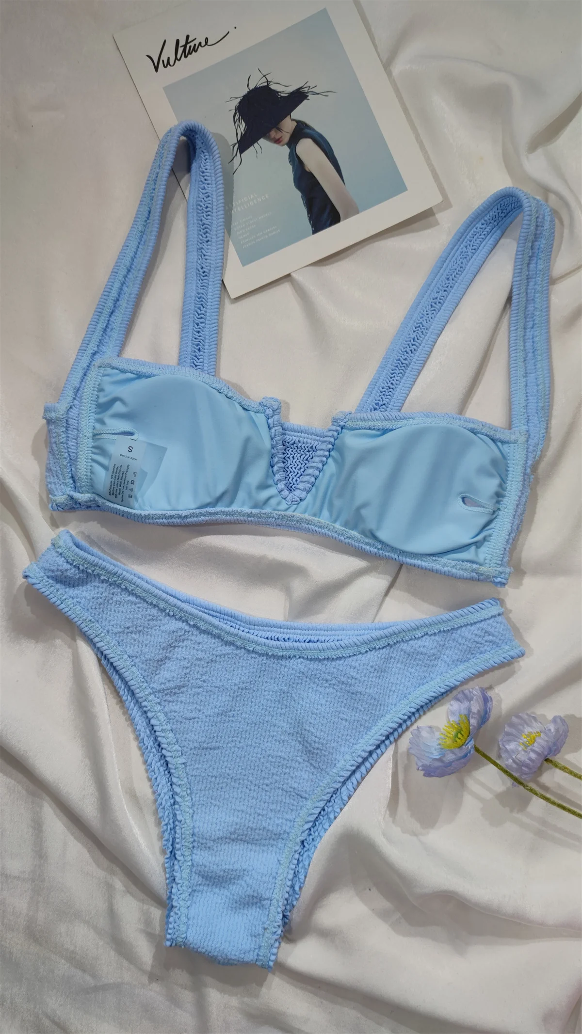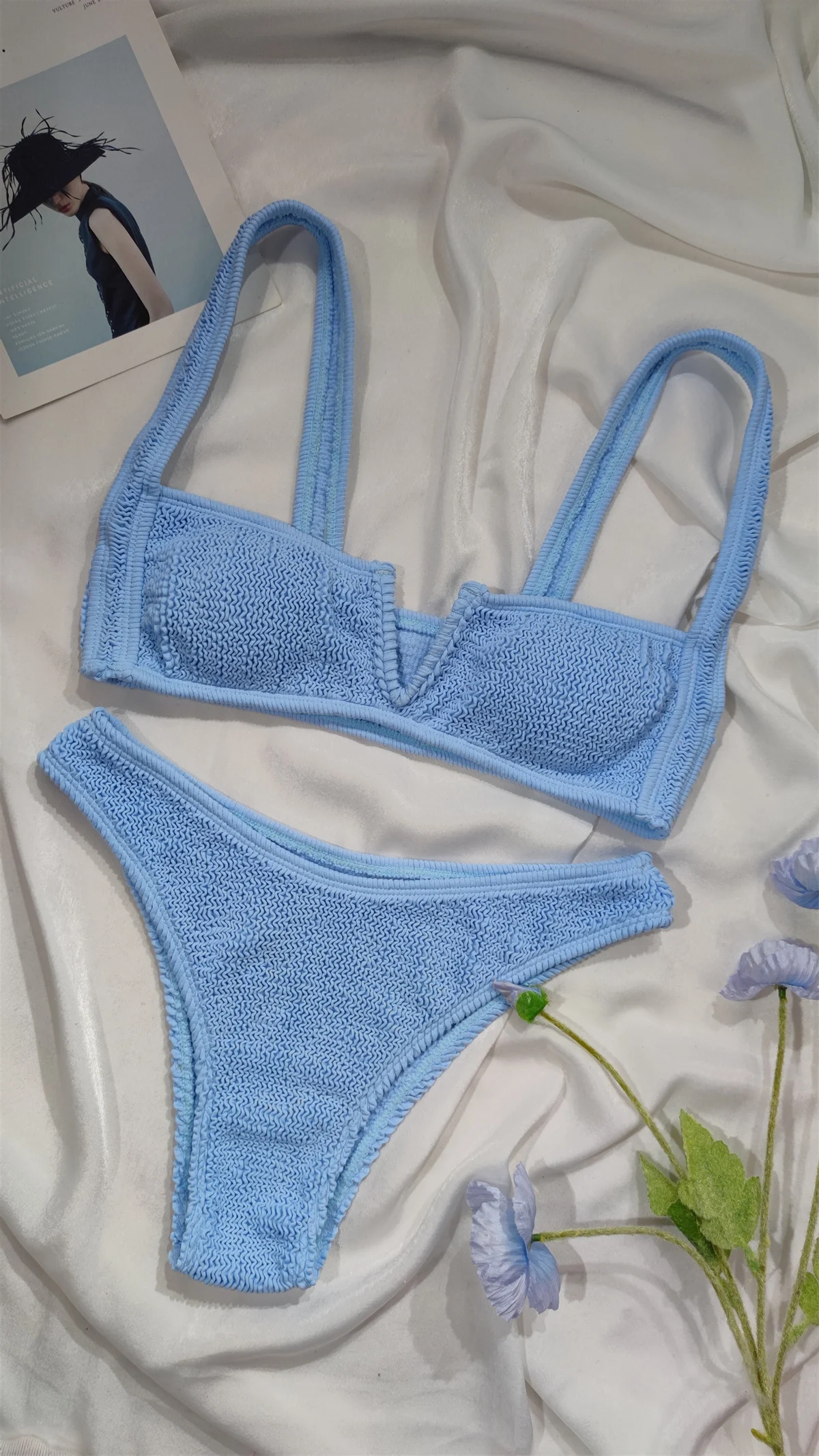 Wholesale Custom Seersucker Fabric V Neck Swimwear Women Bikini Two Piece Swimsuit