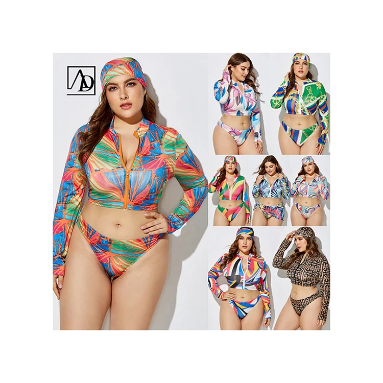 Aide 5XL Sexy Print Floral Tie Dye Zip Long Sleeve Triangle Scarf Three Piece Swimsuits Bikini Plus Size Swimwear for Fat Women