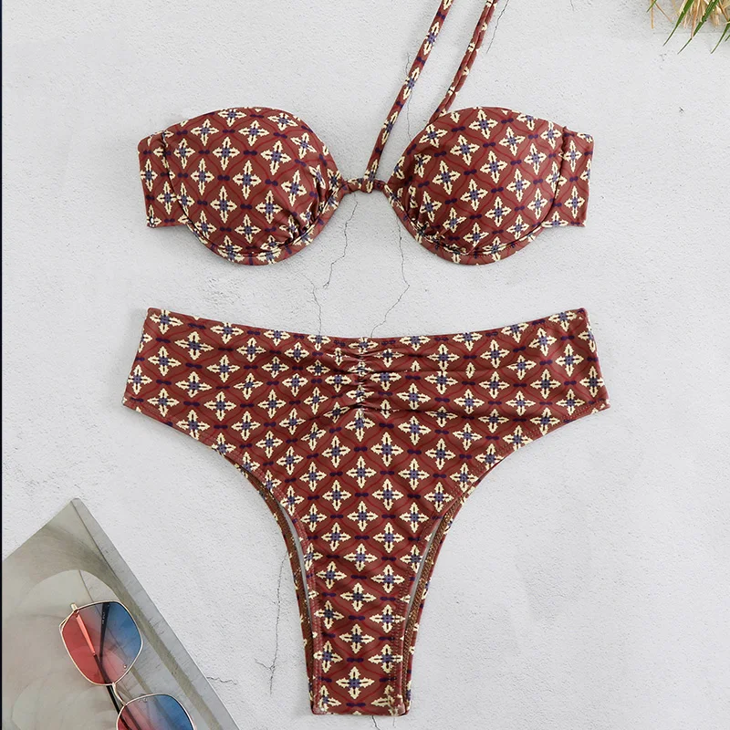 Single Shoulder Strapless Strap High Waist Bikini Sexy Printed Split Swimsuit for Women