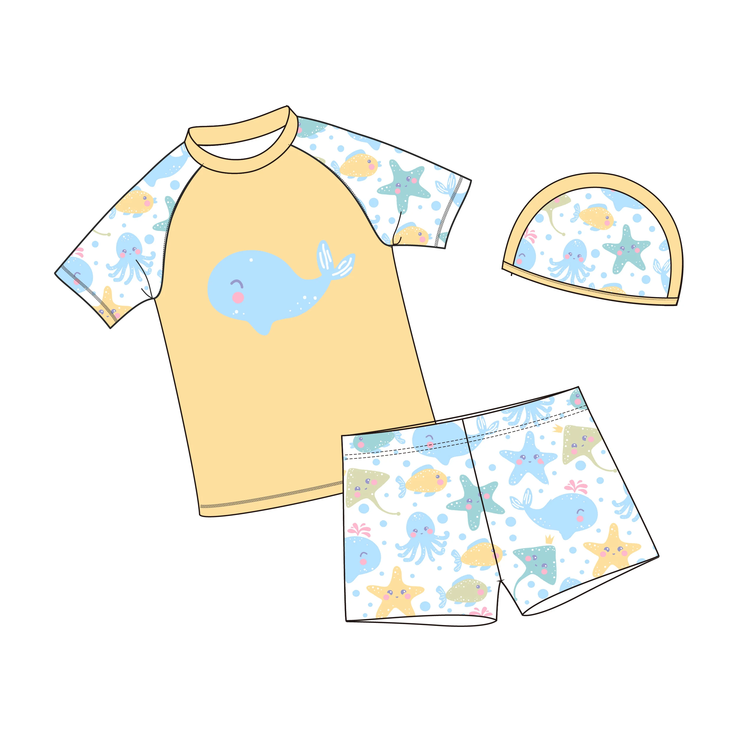 Quick-Drying 3-Piece Cartoon Shark Print Swim Suit for Boys New Sun Protection Children's Clothing Set With Cap