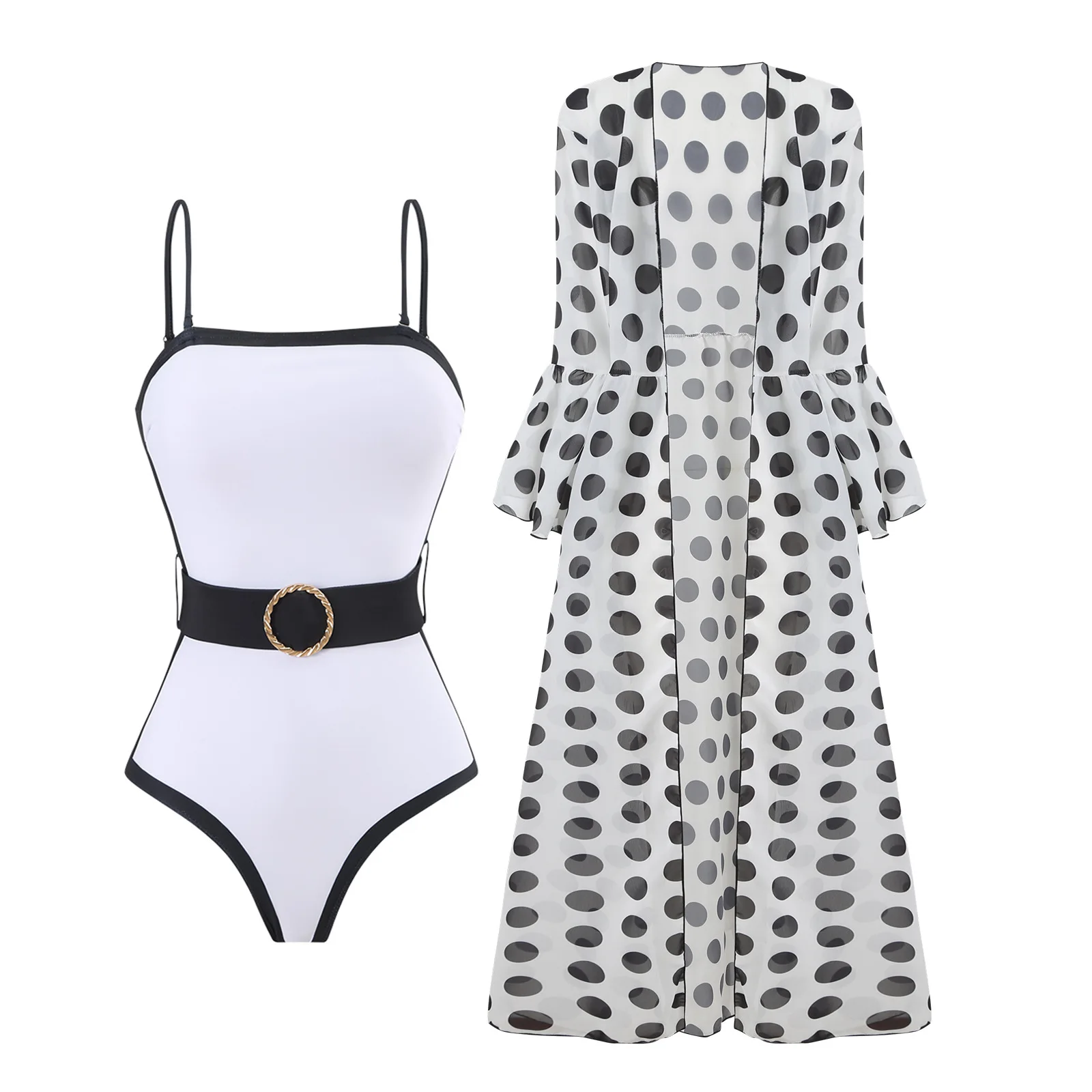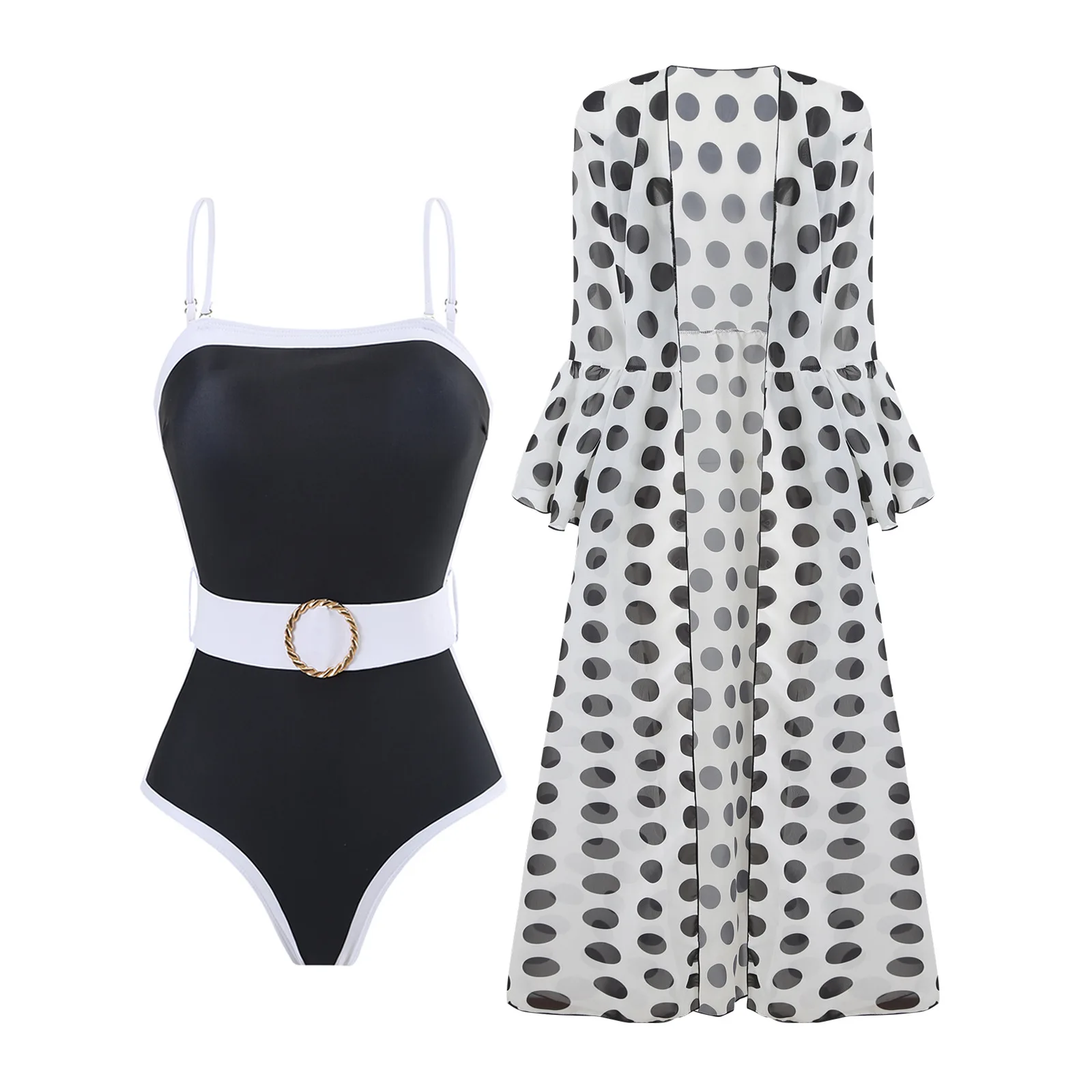 2026 Popular Women's One-Piece Swimsuit Set Solid & Floral Black & White Waistband Slimming & Belly Covering Bikini XL Size