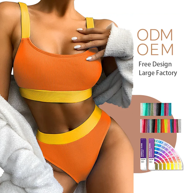 2021 Women's Highwaisted Bikini Orange Rubber Band Swimsuit Plunge Neck More Coverage Bottom Patchwork Pattern Spandex/Nylon