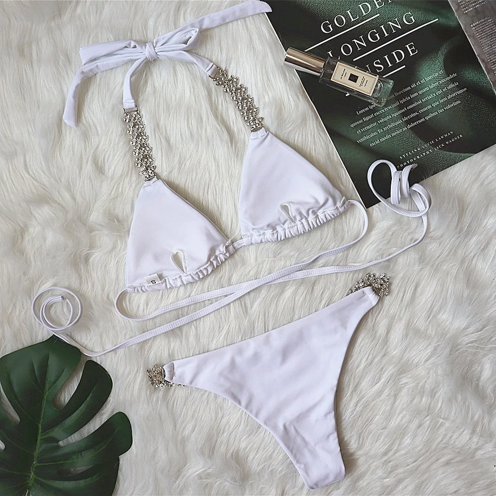Halter Solid Color Metal Chain Crystal Diamond Women's Fashion Sexy Beach Swimsuit Custom Swimwear Rhinestone Bikini
