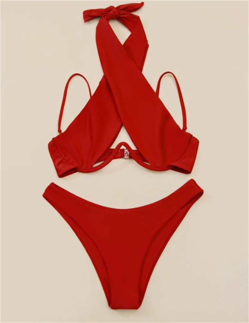 2026 New Breathable Quick-Dry Spandex/Polyester Tie Neck Push-Up Underwire Split Bikini Multicolor Printed Pattern for Women