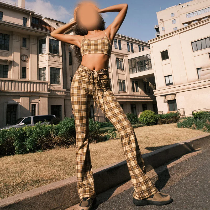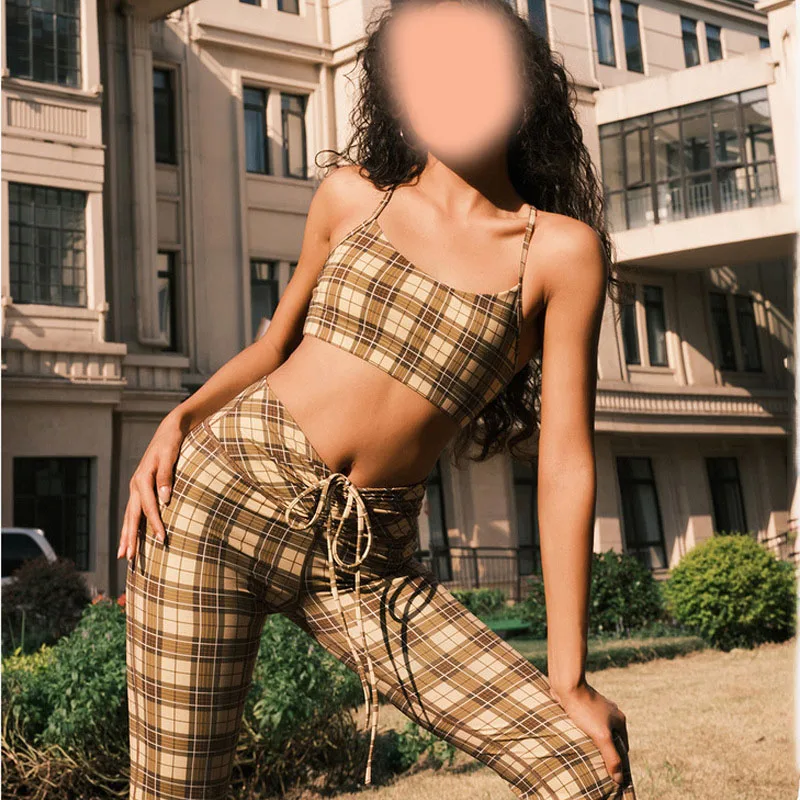 Women's High Waist Two-Piece Yoga Set Casual Plaid Short Top and Trousers Printed Chest Wrap Shock-proof Bra for Summer