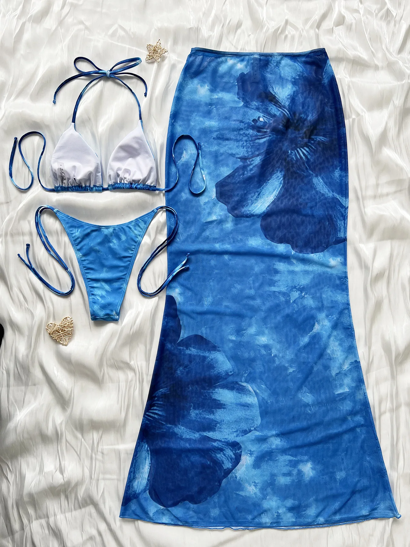 Brazilian Off-the-Shoulder Backless Bikini Women Custom Logo Sexy Solid Color Three-Piece Straps Pleated Print Geometric Halter