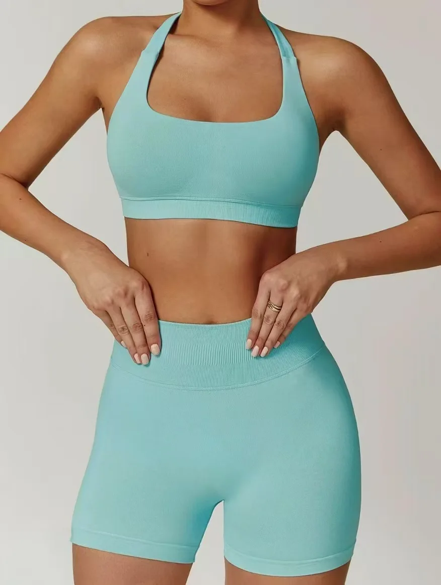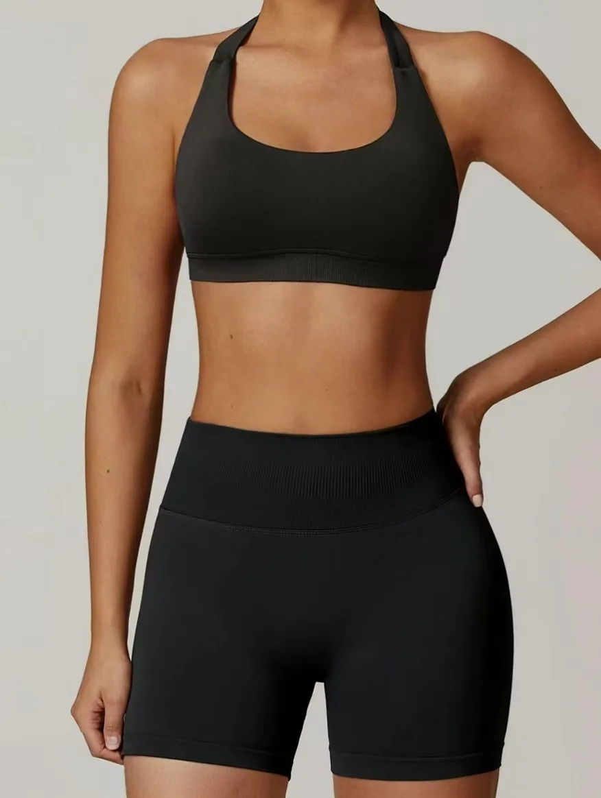 Beautiful Back High Waist Peach Sports Bras Shorts Suit Sexy Halter Neck Pilates Yoga Vest Training Fitness Bra Elastic Waist