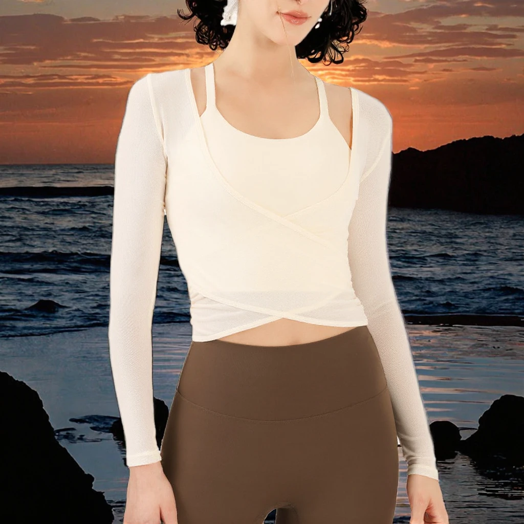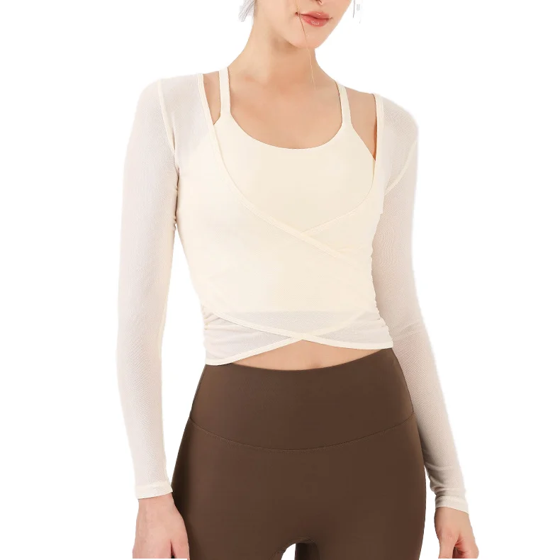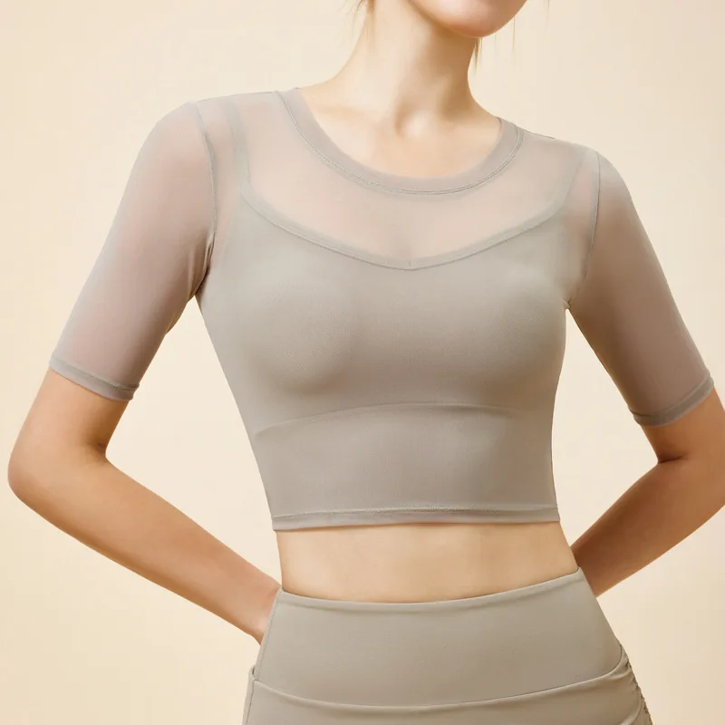 Women's Elegant Slimming Mesh Yoga Top with Built-In Bra Breathable Fitness Pilates Wear for Spring and Summer
