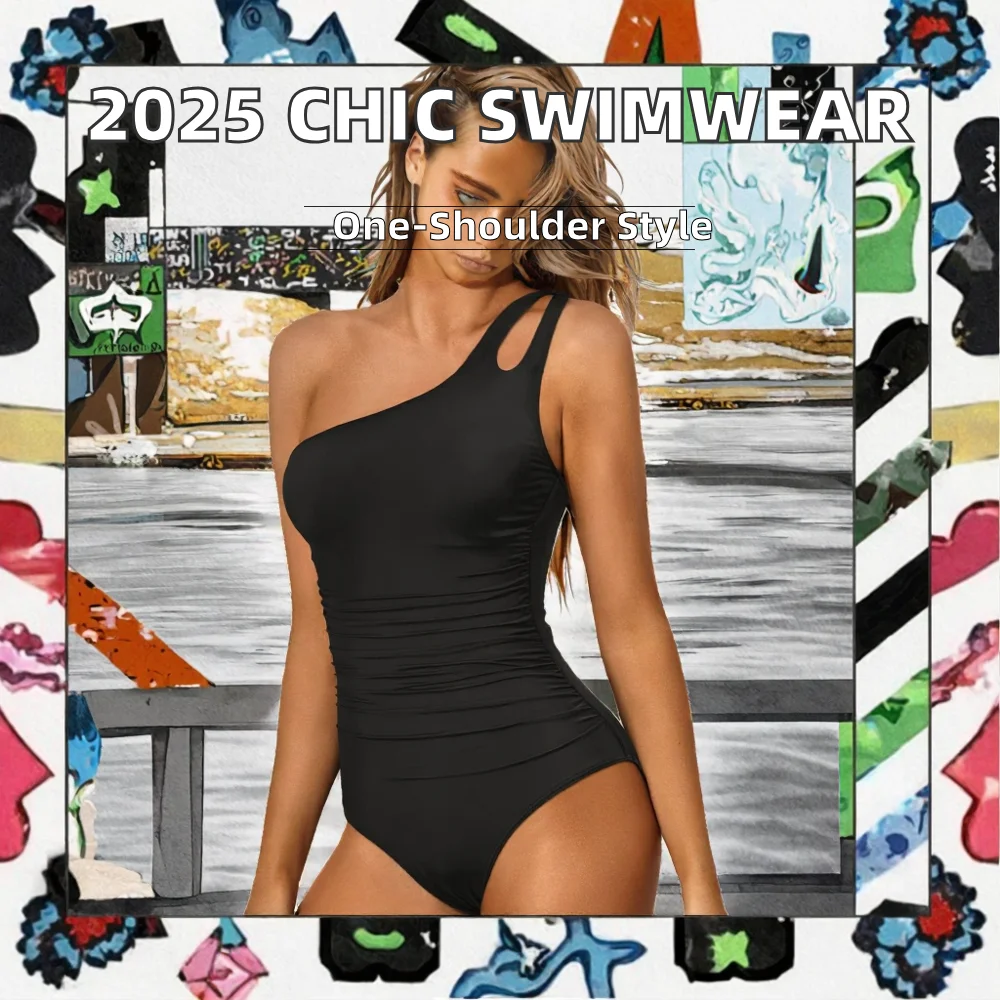 2026 Summer Modest Full Coverage Keyhole Bikini Women's One Shoulder One Piece Swimsuit Tummy Control Solid Pattern Swimwear
