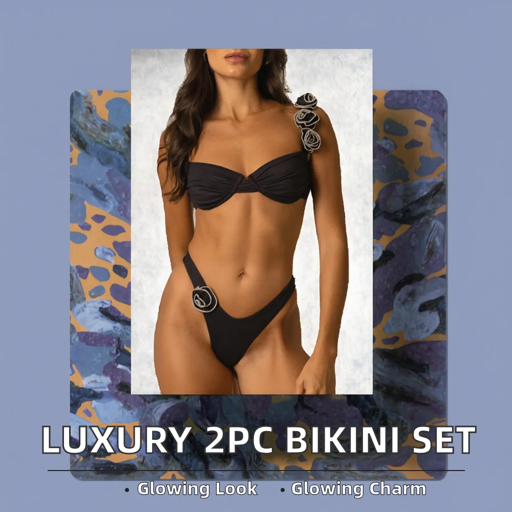 Luxury Designer 3D Camellia Flower Pattern Bikini Set Solid Color Swimsuit High Quality 2Pcs/Set for Women Fashion Swimwear