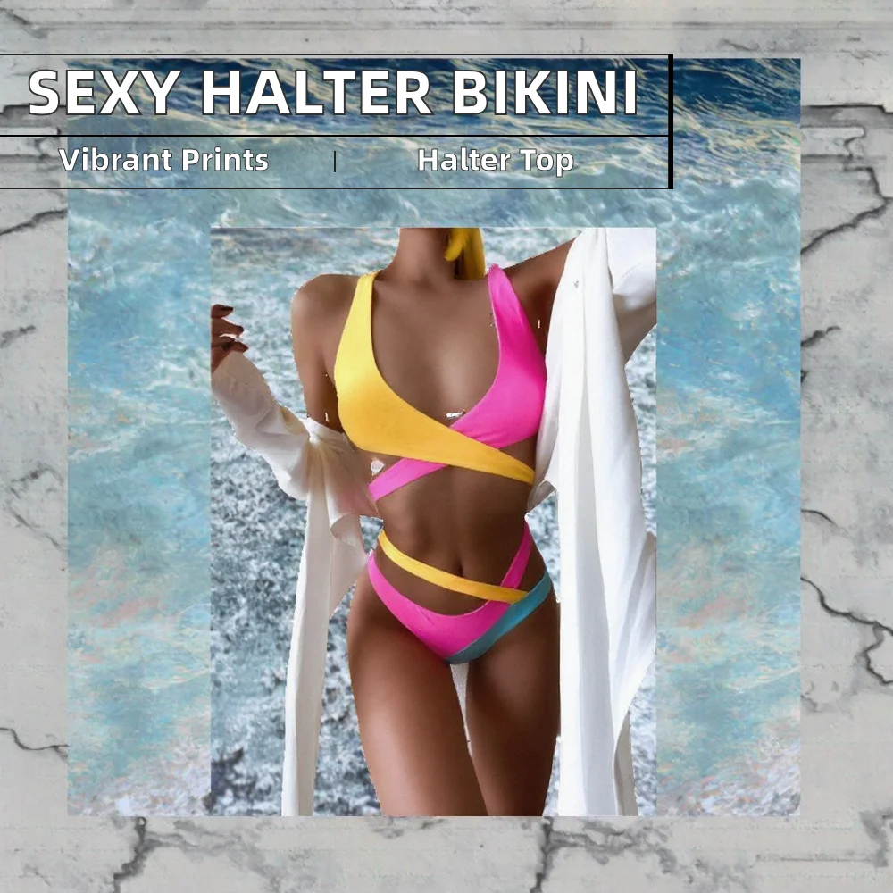 OEM Custom Ladies Swimwear New Sexy Solid Color Cross Bandage Halter Two Piece Bikini Push Bra High Cut High Slit Beachwear