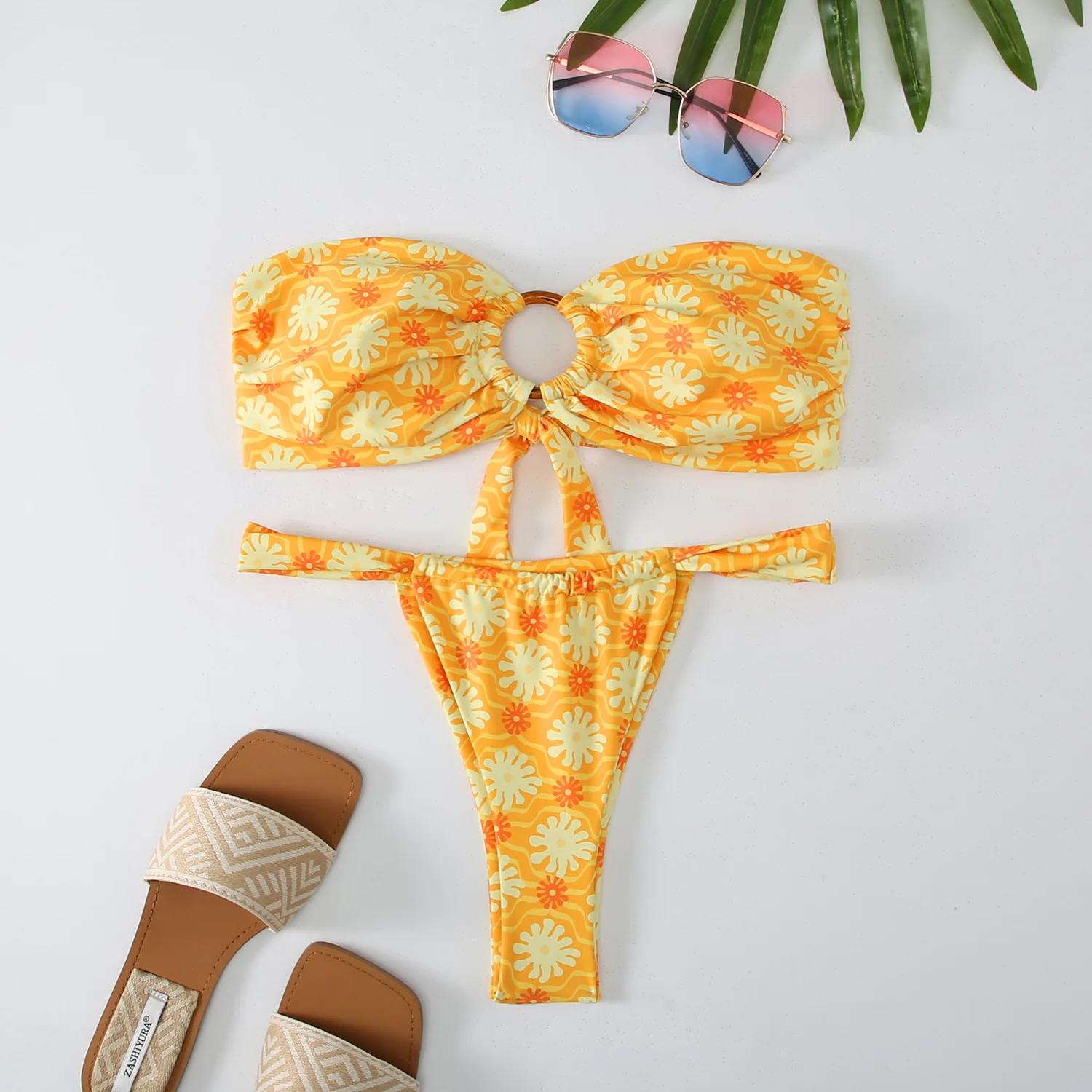 Women's Printed Strapless Ring Bikini Set Summer Beach Swimwear Bathing Suit with Thongs Bottom Two-Piece Set
