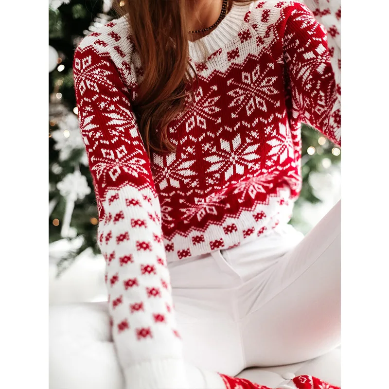 High Quality Red Women's Winter Pullover Sweater with Christmas Snow Print Loose Fit Crew Neck Long Sleeves High Street Style