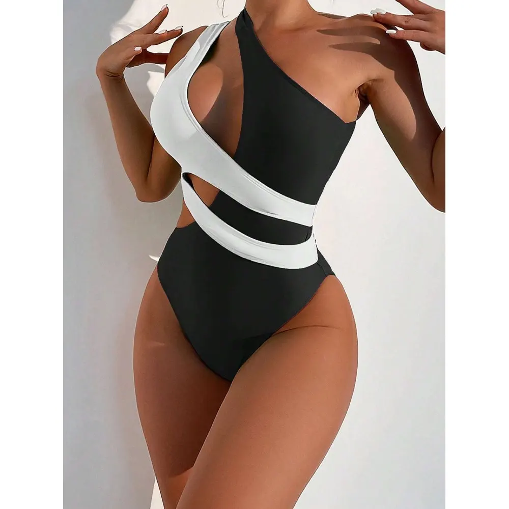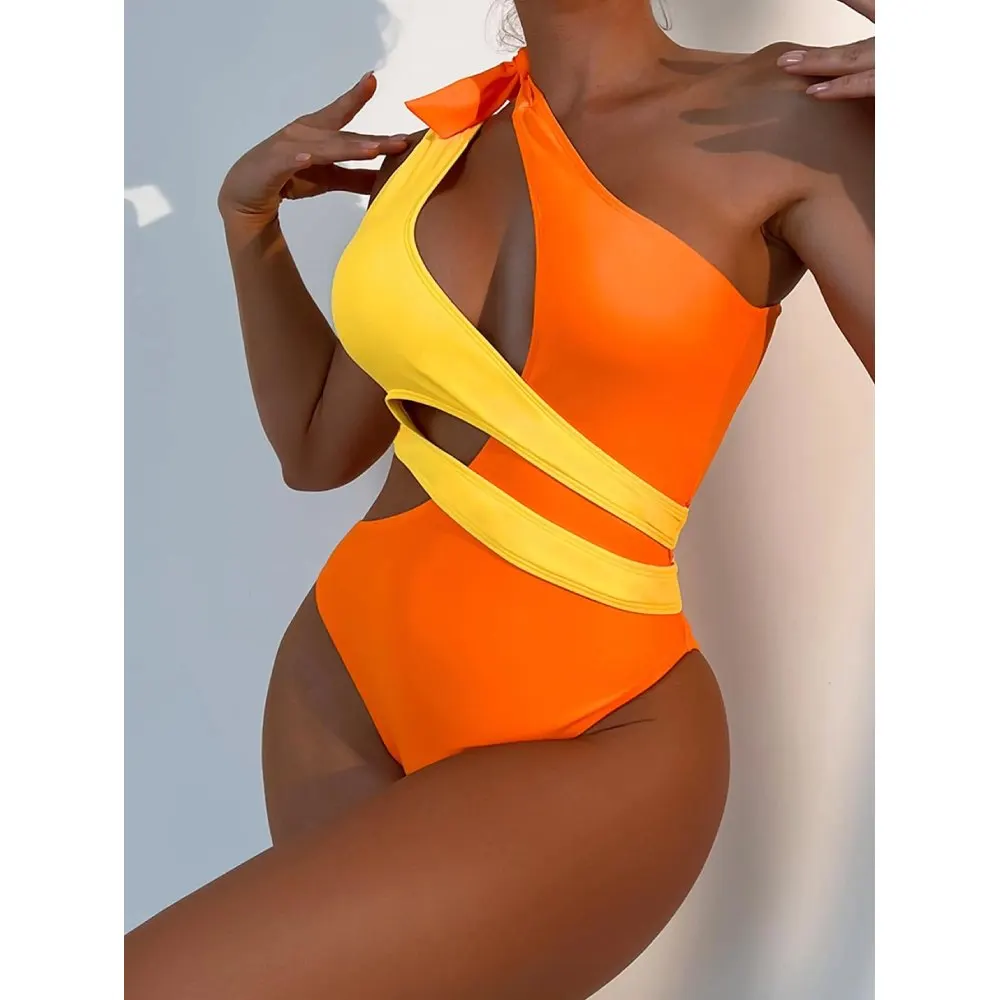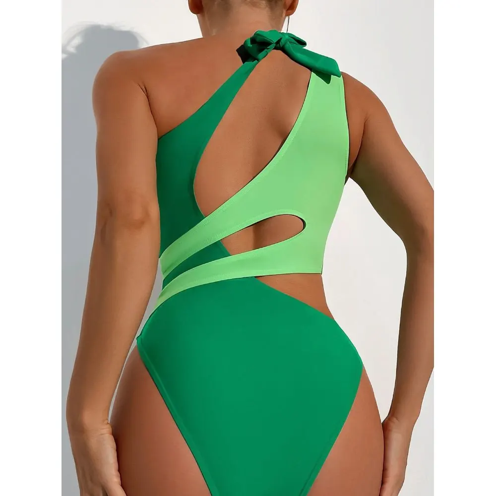 Cikini Colorblock Cut-out One Shoulder One Piece Swimsuit Summer Beach Swimwear Bathing Suit for Women