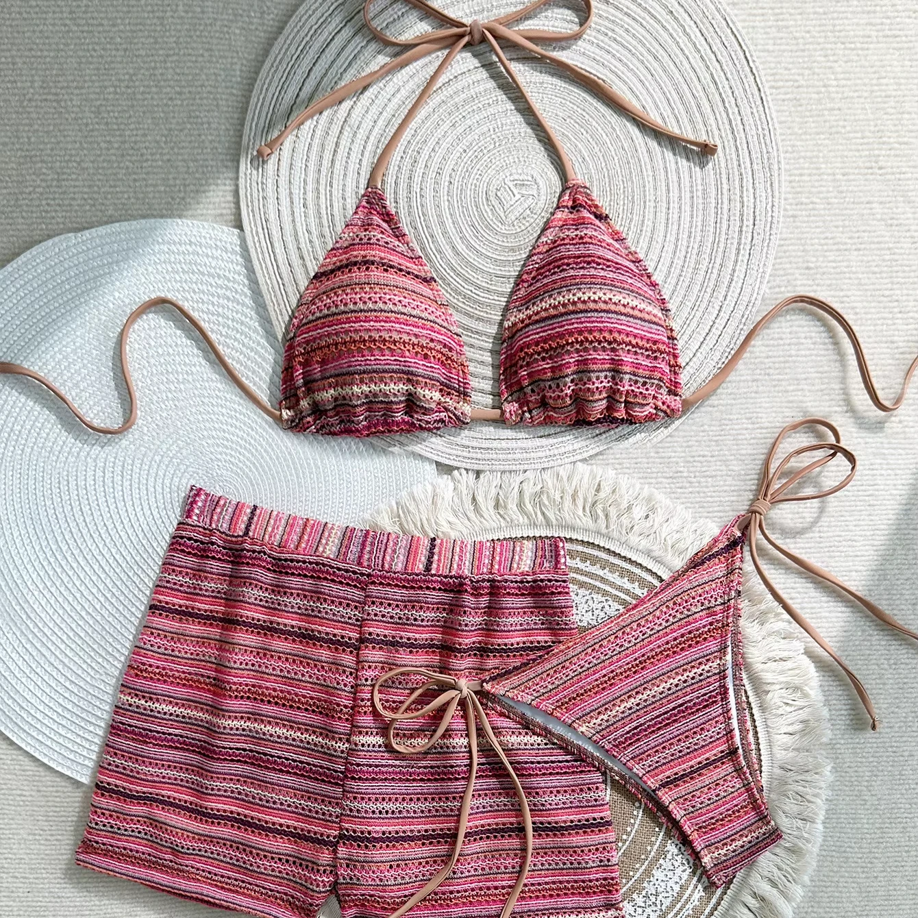 New Halter Solid Knit Brazilian Bikini Set Three Piece Spandex/Nylon Triangle Bra Nontoxic Sexy Swimwear for Women