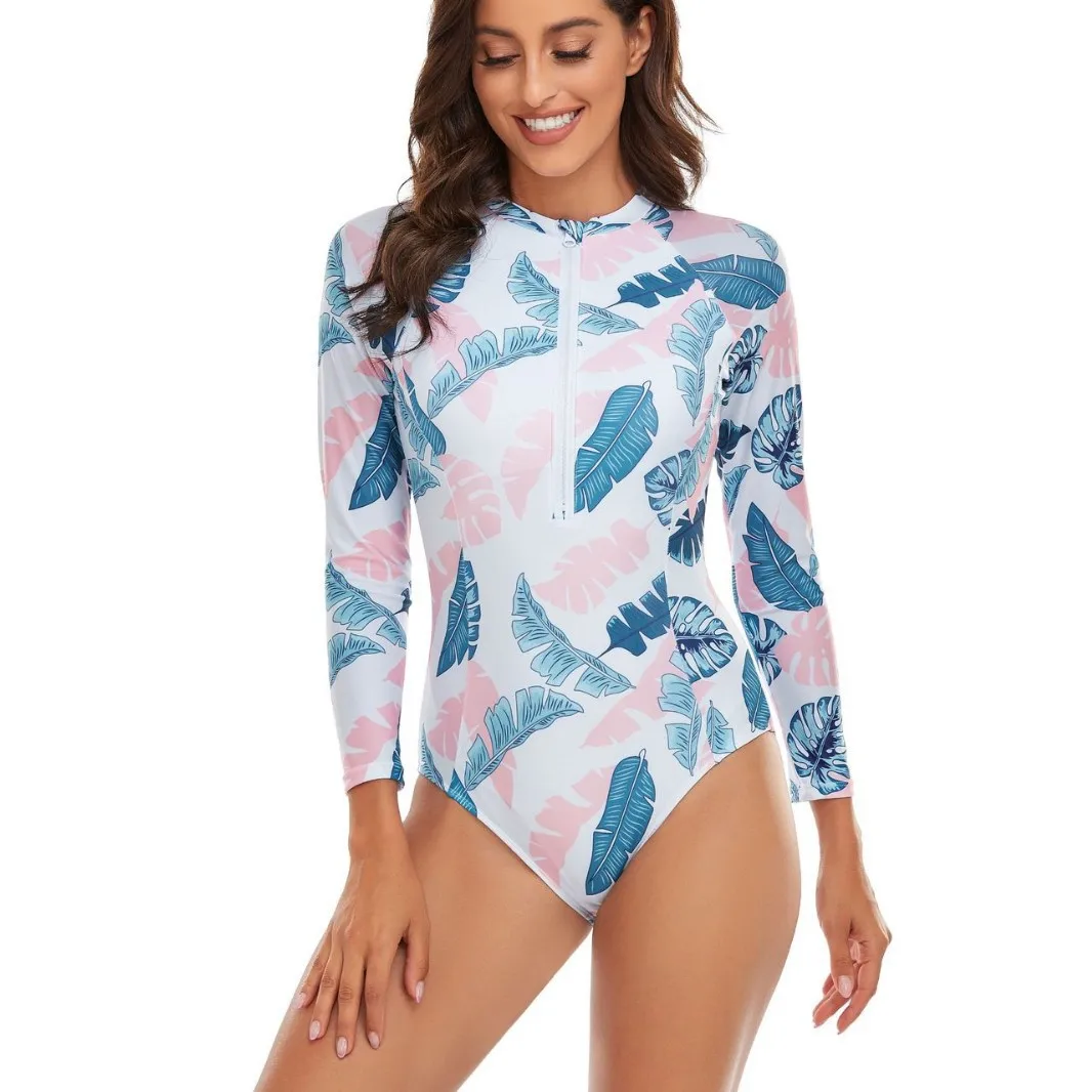 Women Eco-Friendly Breathable Quick Dry Zip Surfing Swimsuit Long Sleeves Patchwork One Athletic Swimwear Rash Guard Outdoor