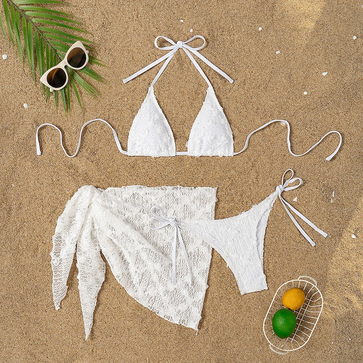 Sexy Halter Neck Mesh Bikini Three Piece Set Eco-friendly Sheer Cover-Up Swimwear for Women