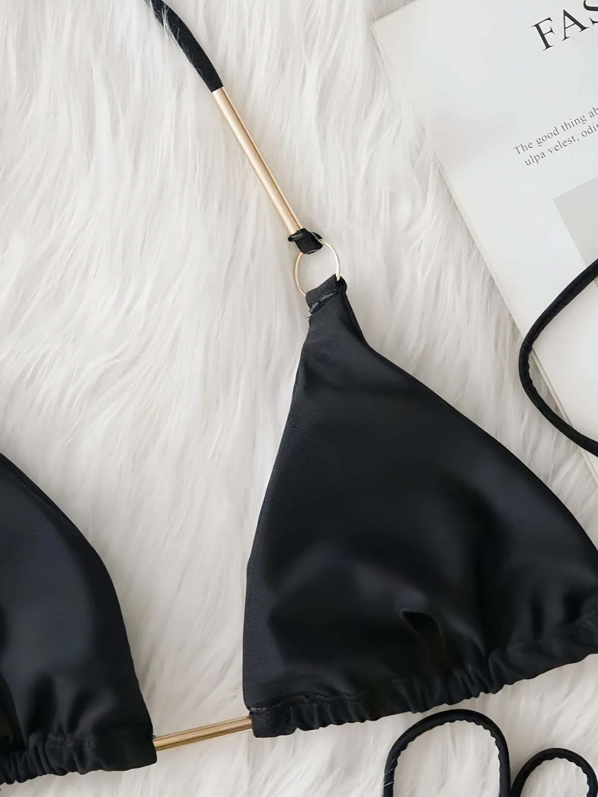 Sexy High Waist Bikini with Metal Detail, Solid Color Cutout Two Piece Swimwear