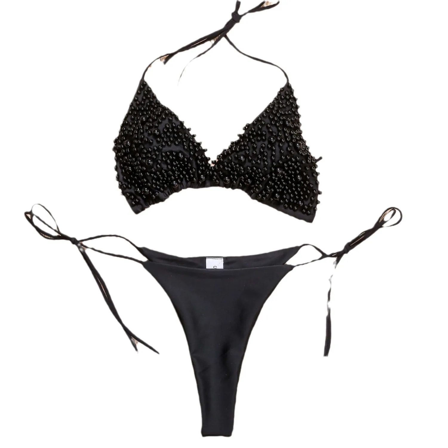 Summer Beachwear Sexy Pearl Bikini Set for Women Halter Neckline Solid Color Thong Swimsuit Micro Triangle Swimwear 2-Piece Set