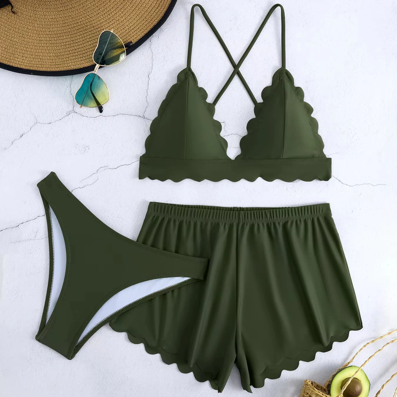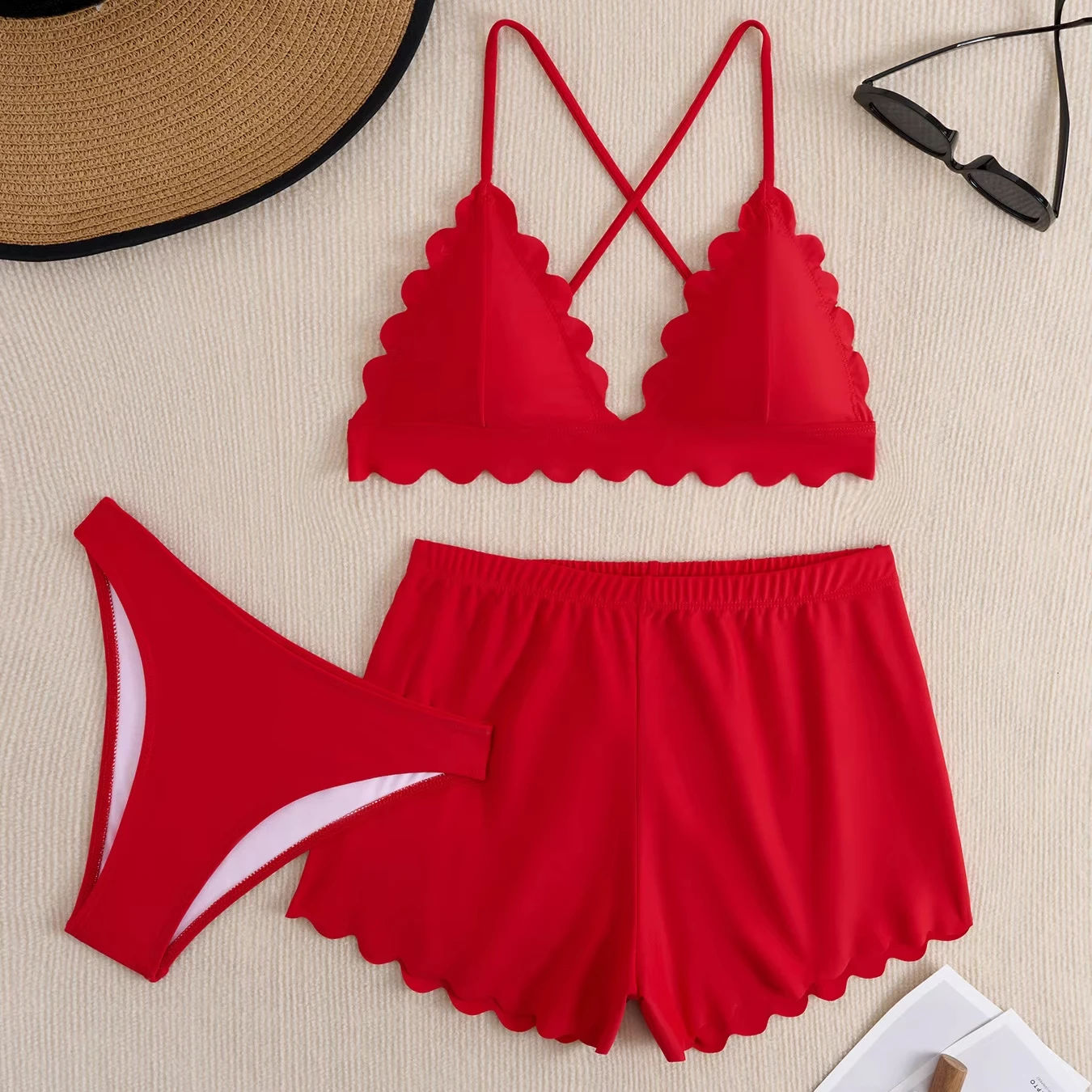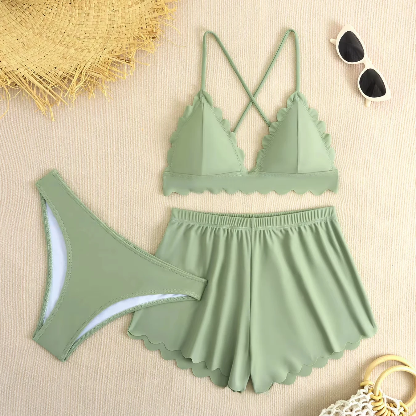 Stylish Women's Three-Piece Beach Swimwear Set Solid Color Top Shorts with Flounce Trim Cover-Up for Beach & Swim