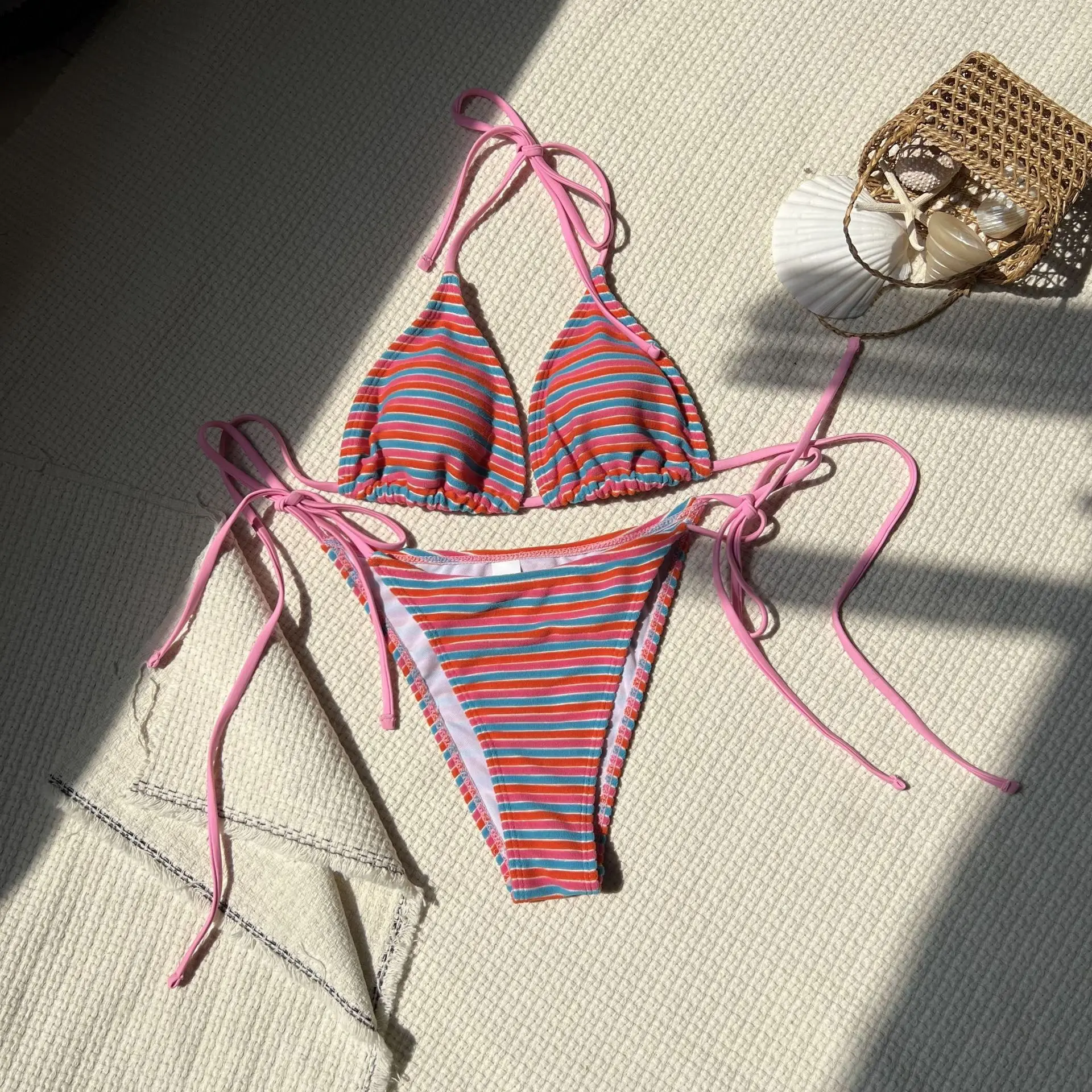 Soft Fabric Striped Halter Bikini Set for Women Sexy Girls Swimsuit Two Piece Swimwear with Side Tie Bottoms