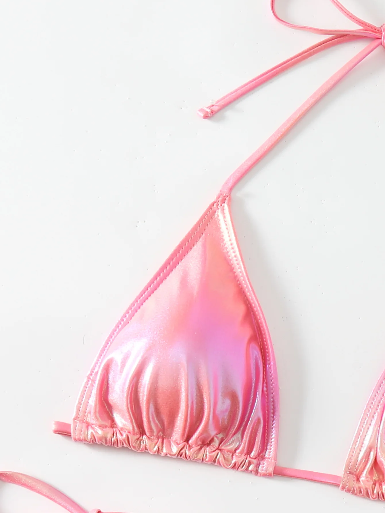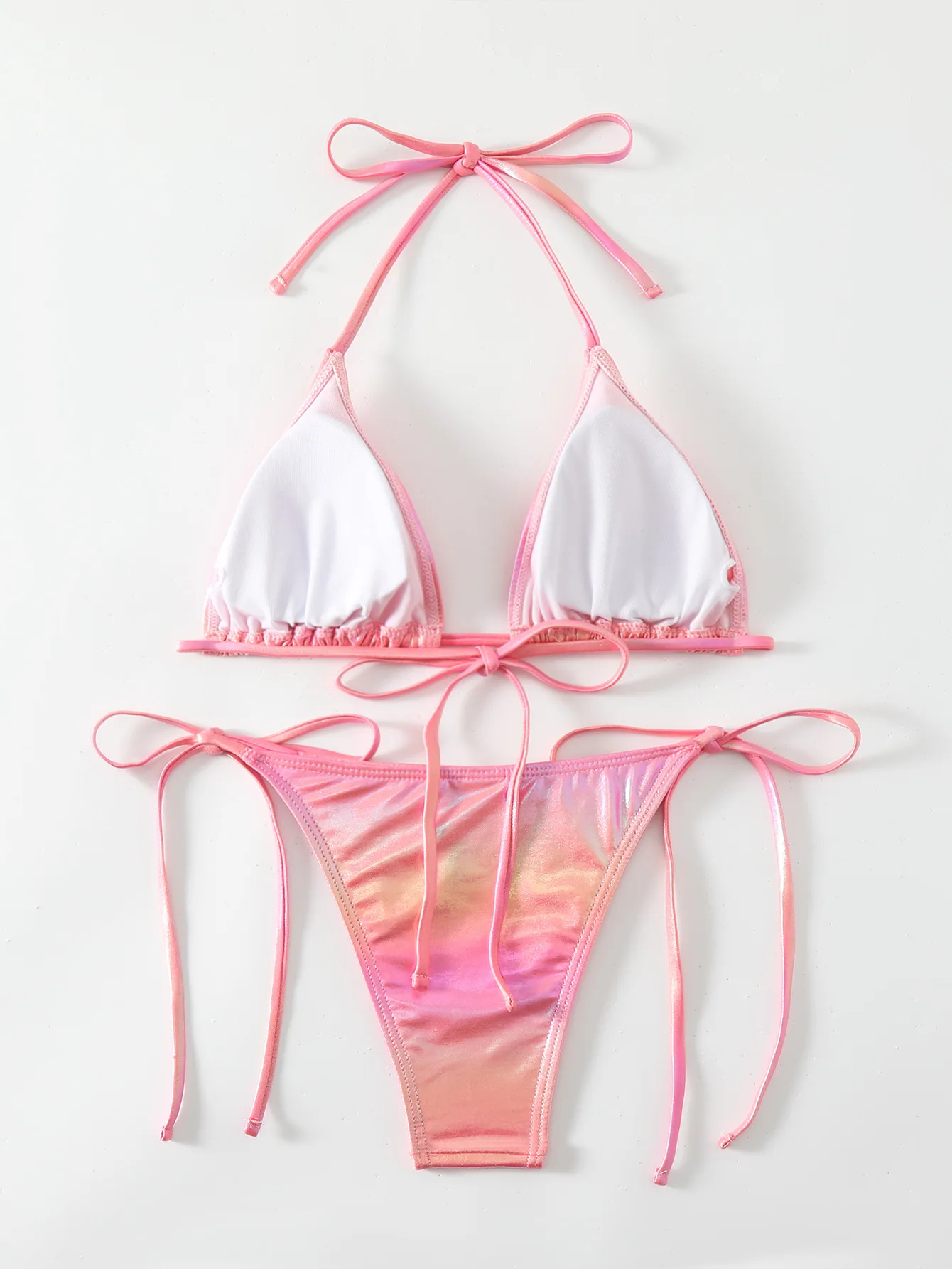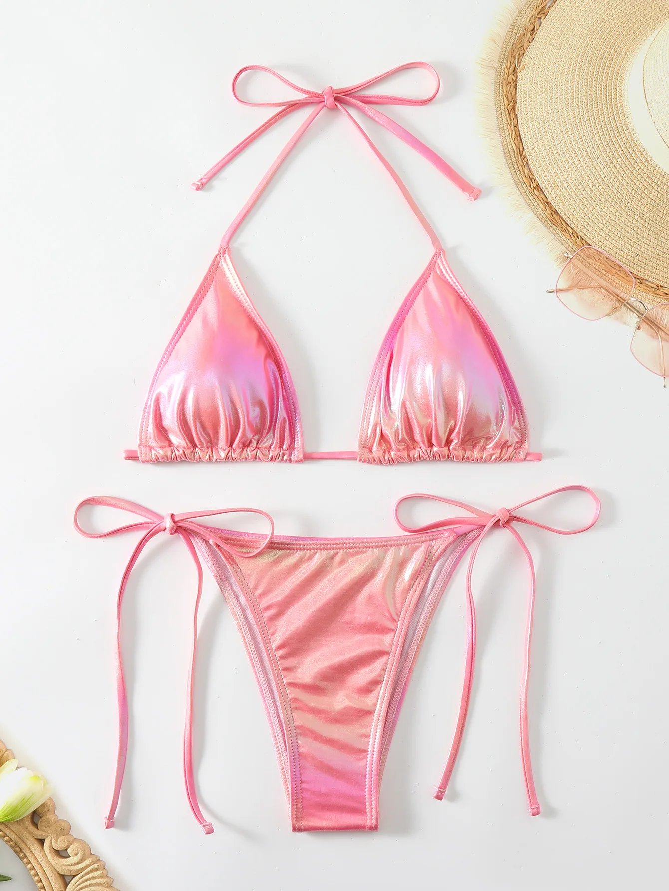 Shiny Pink Halter Backless Bikini Set for Women Sexy Tie-Up Two-Piece Swimsuit Beachwear