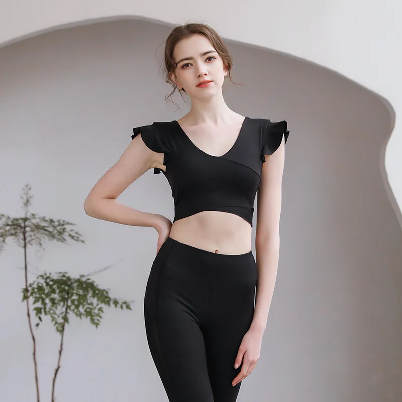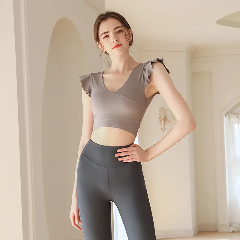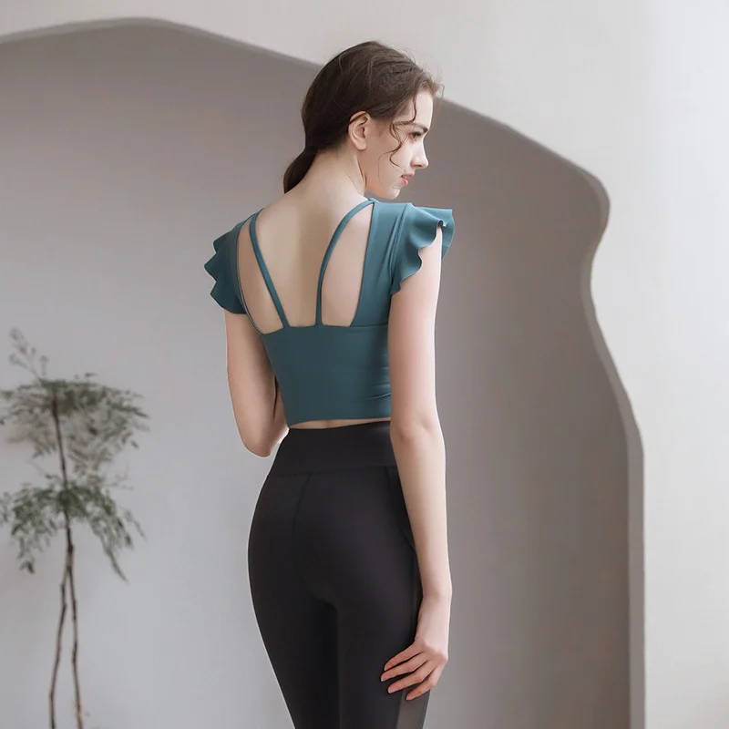 Breathable Ruffle Sleeve Padded Yoga Top for Women Short Sleeve Front Logo Athletic Shirt for Workout Running Training