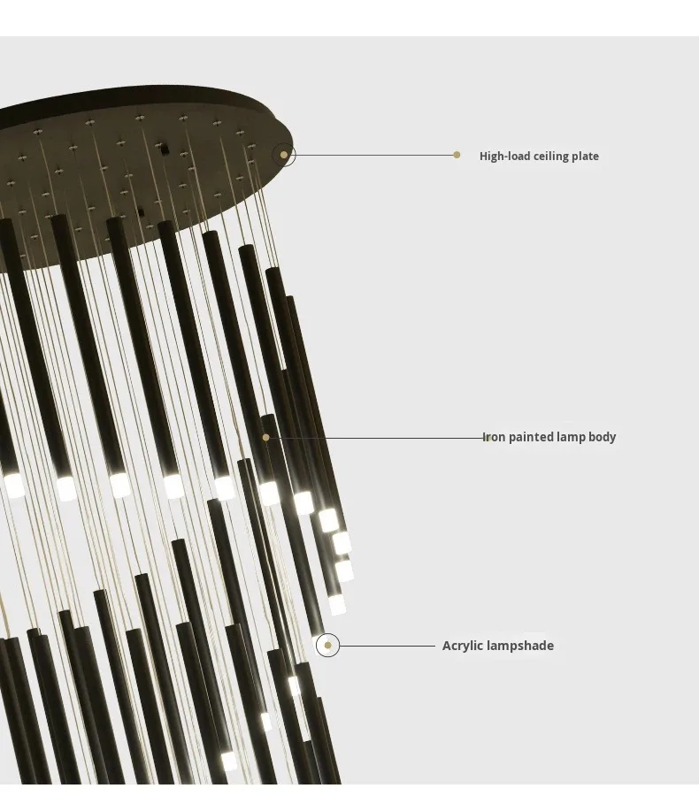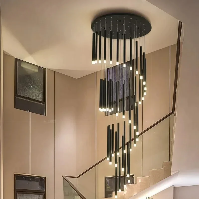 JACKSUN Large Long Spiral Iron 49-Light Black Chandelier High Ceiling 6000K 3m Pendant Hanging Light Fixture for Stairway Villa