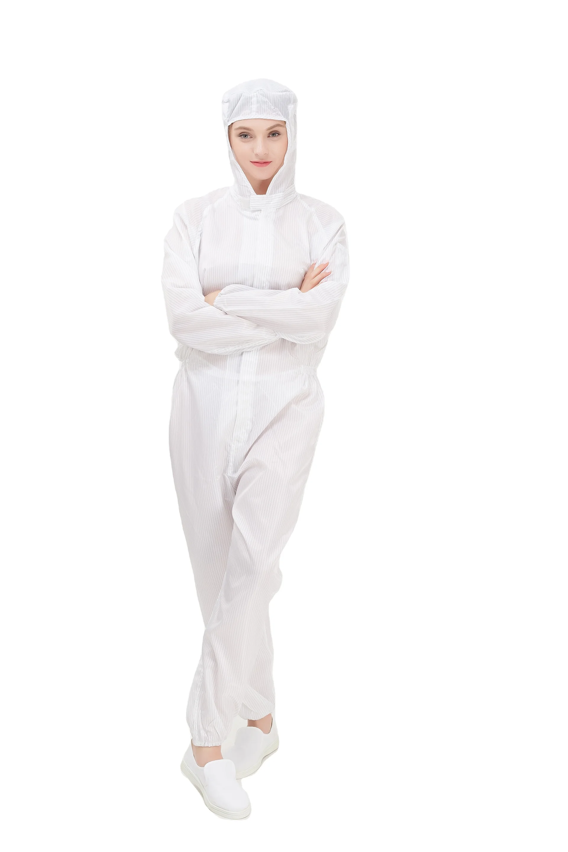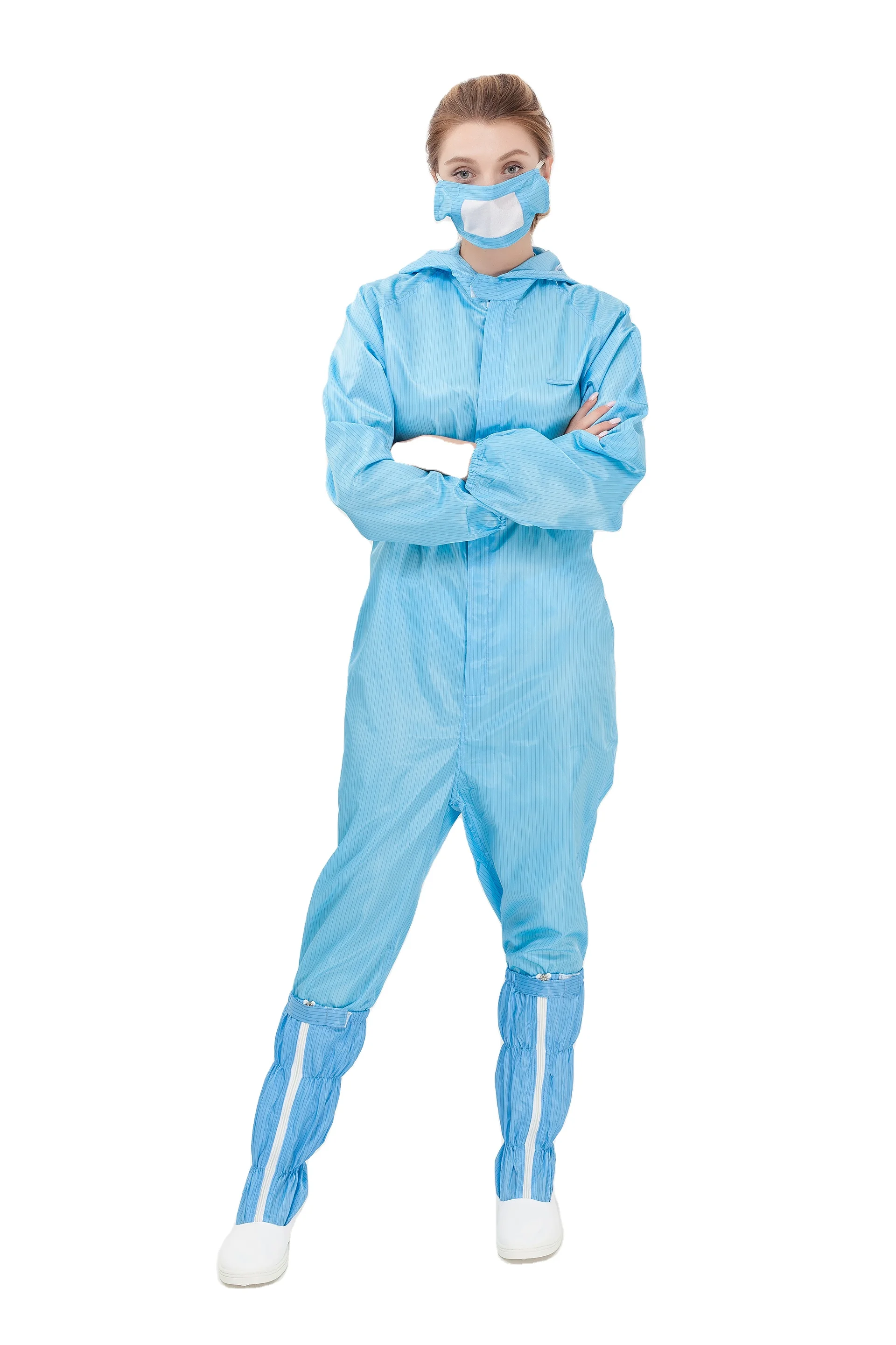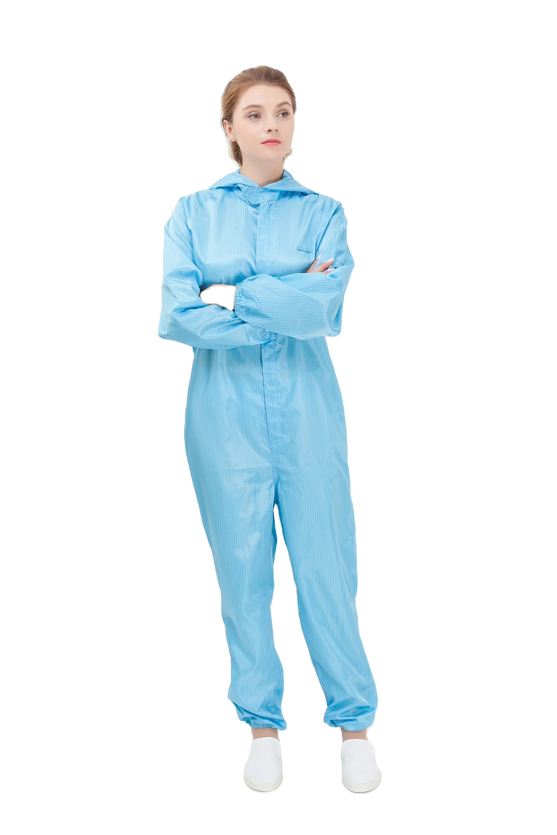 Reusable High-Tenacity Polyester Cleanroom Work Coverall Hood ESD Anti-Static Unisex Blue White Embossed Food Industry OEM