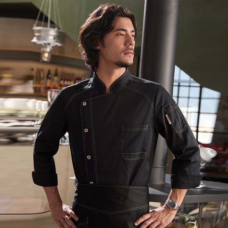 Tesimei Men's Long Sleeve Denim Chef Work Clothes for Autumn Winter for Restaurant Bar Bakery Baking Bread Outfit