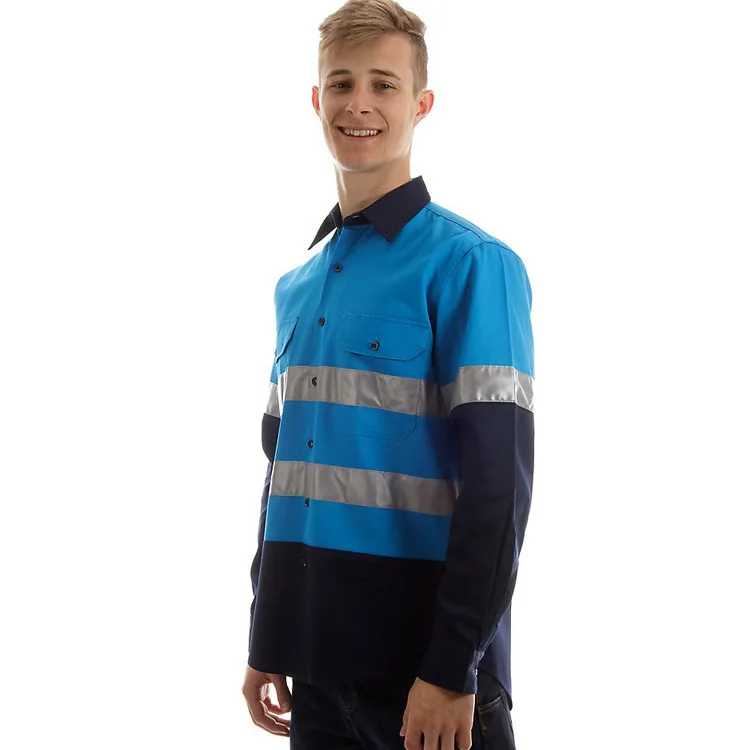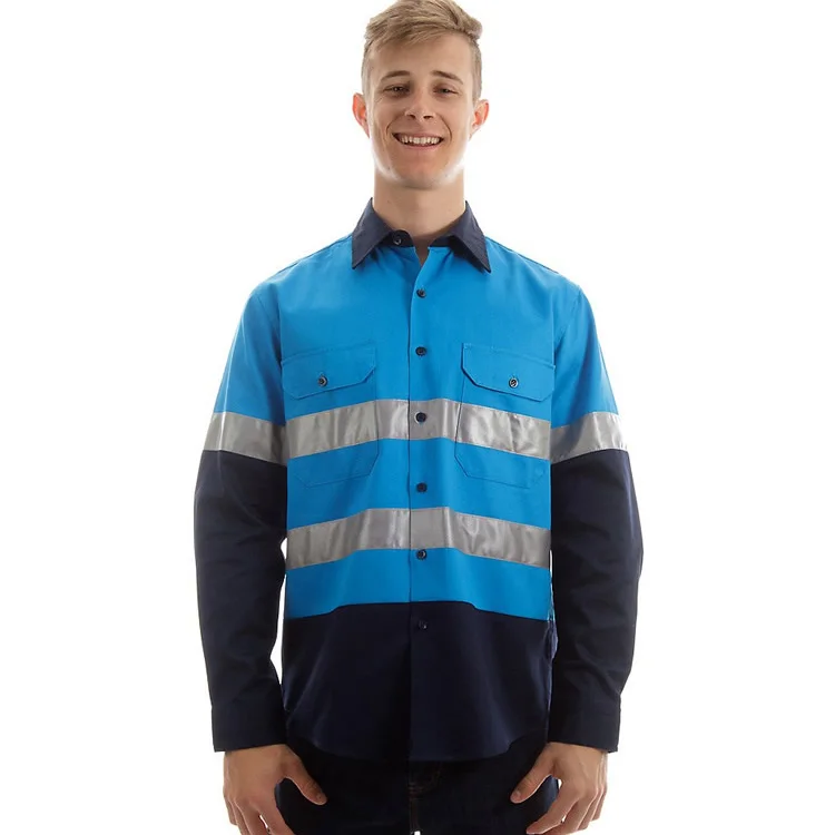 Hot Sale High Visibility 100% Cotton Drill Blue / Navy Two Tone Hi Vis Mechanic Reflective Safety Work Shirt